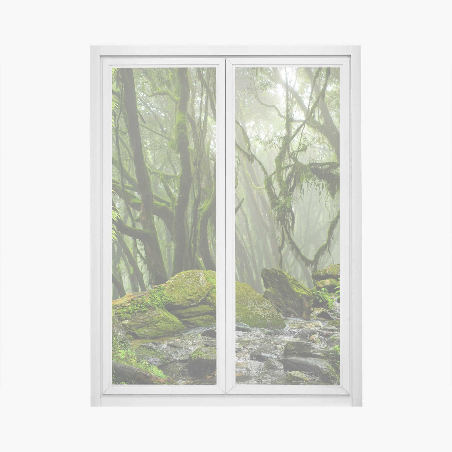 Fensteraufkleber Moosiger wald mit bach im nebel