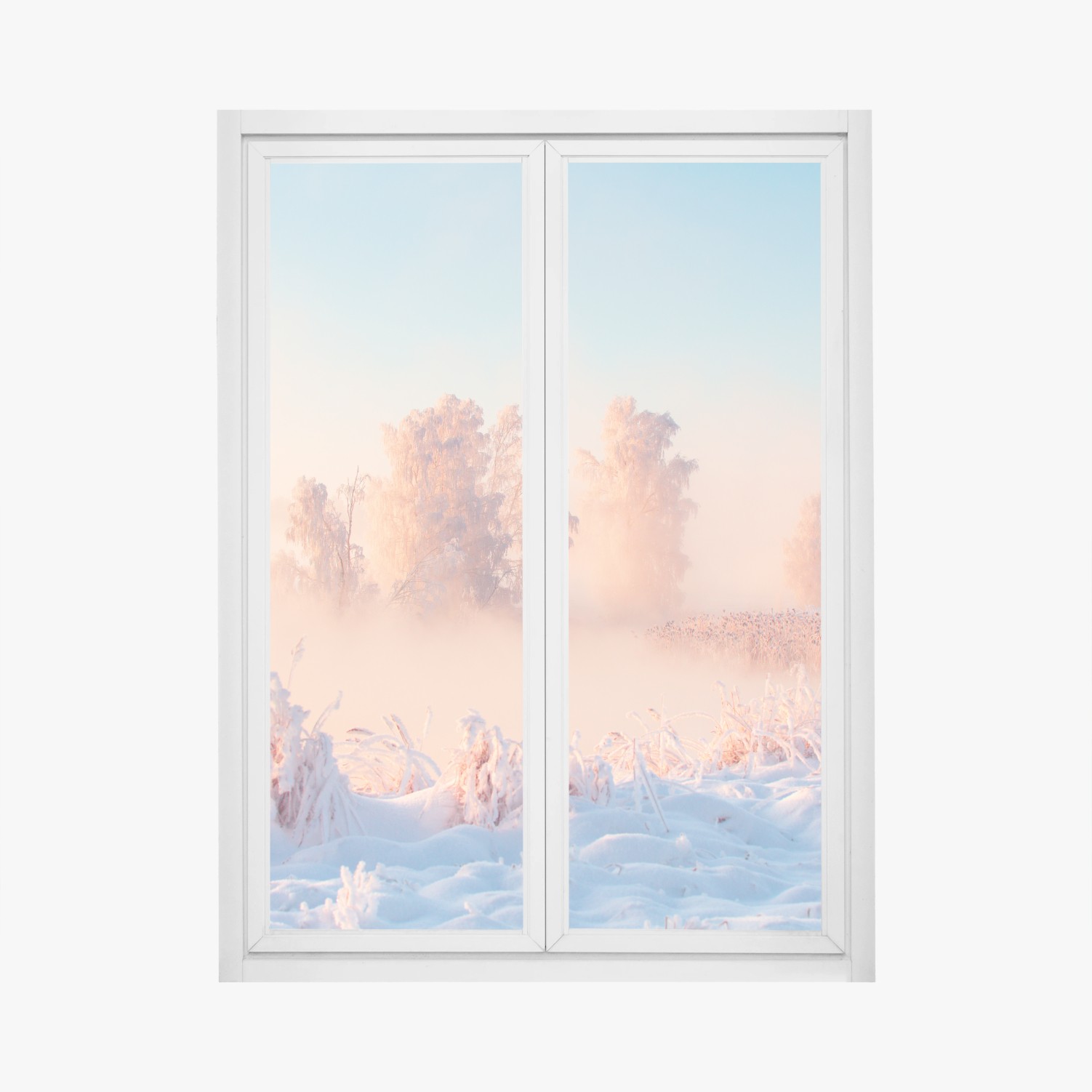 Fensteraufkleber Winterlicher sonnenaufgang über einer frostigen wiese