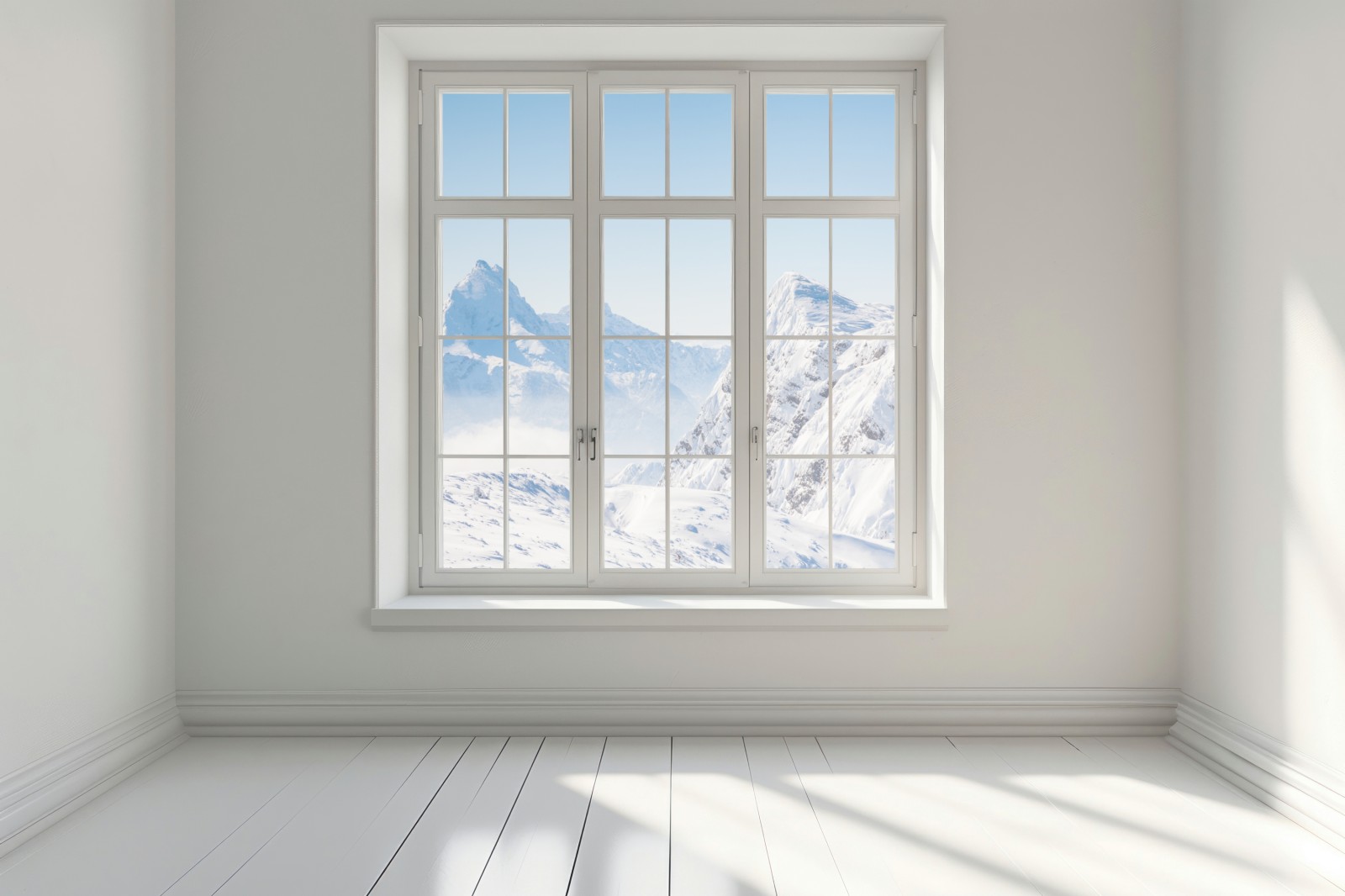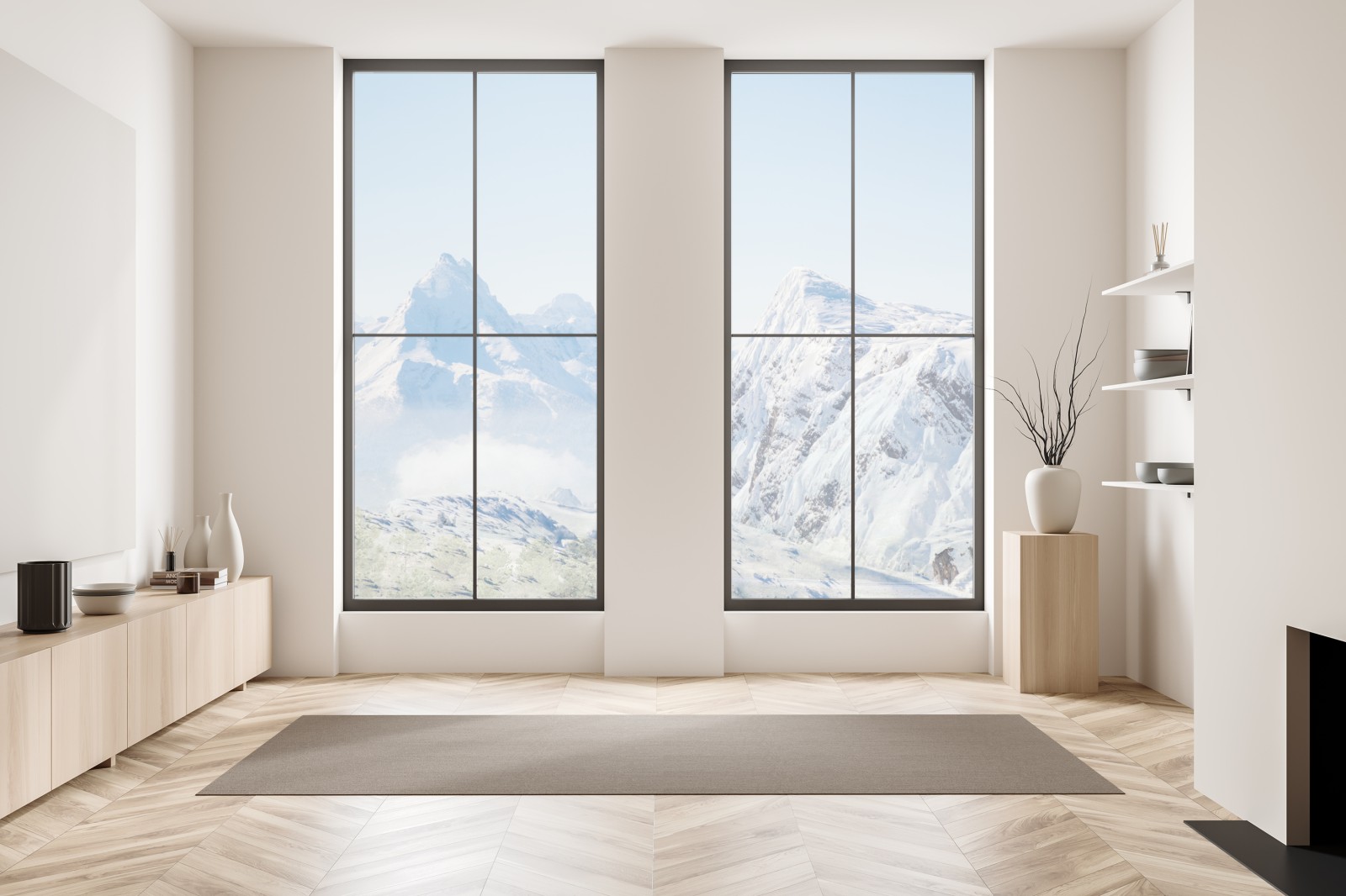 Ein ruhiges Panorama verschneiter Berge bringt frische, alpine Atmosphäre und Weite an Ihre Wände.