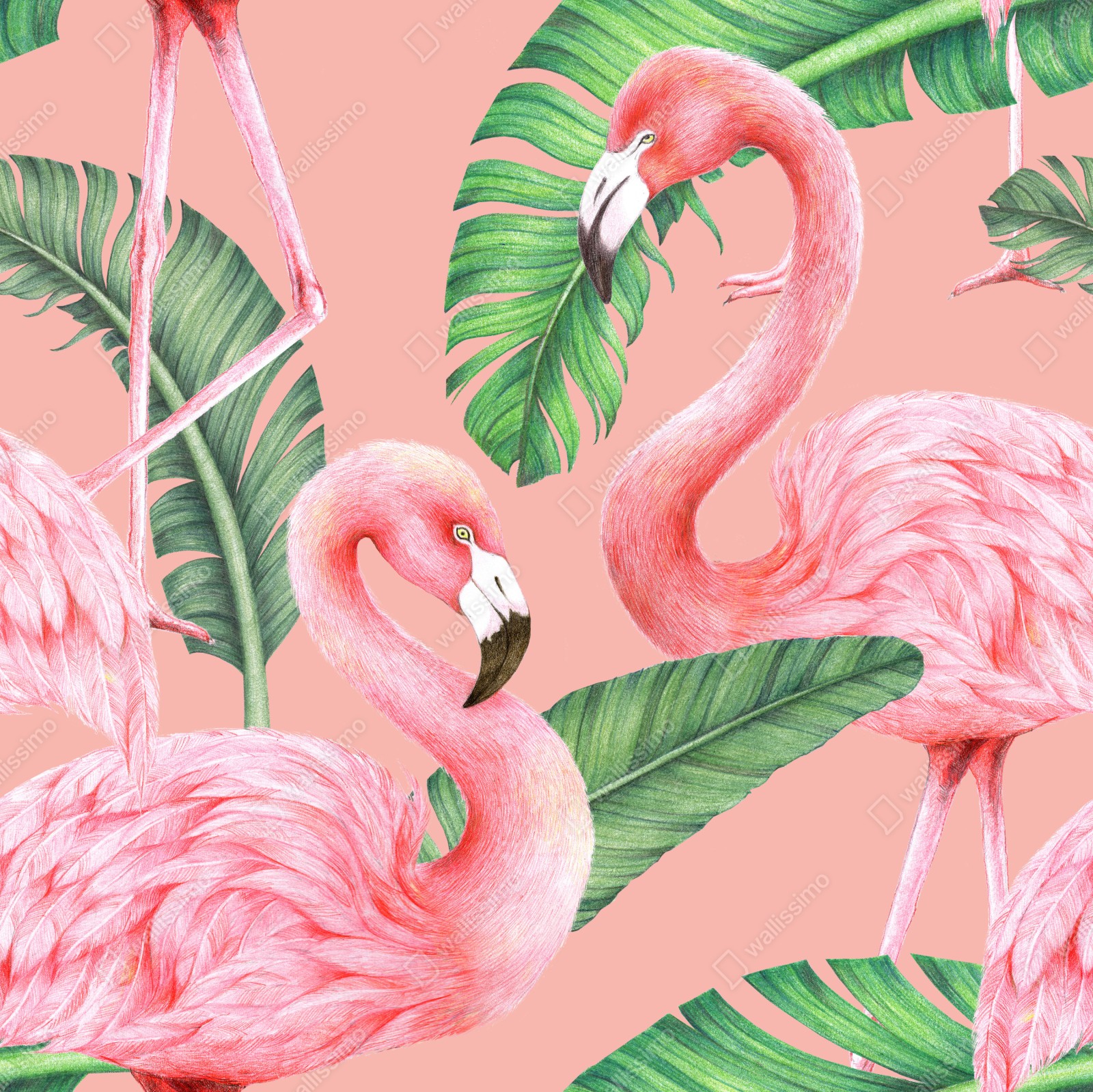 Verspielte rosa Flamingos und üppige grüne Blätter schaffen ein tropisches Muster, das jeden Raum aufhellt.