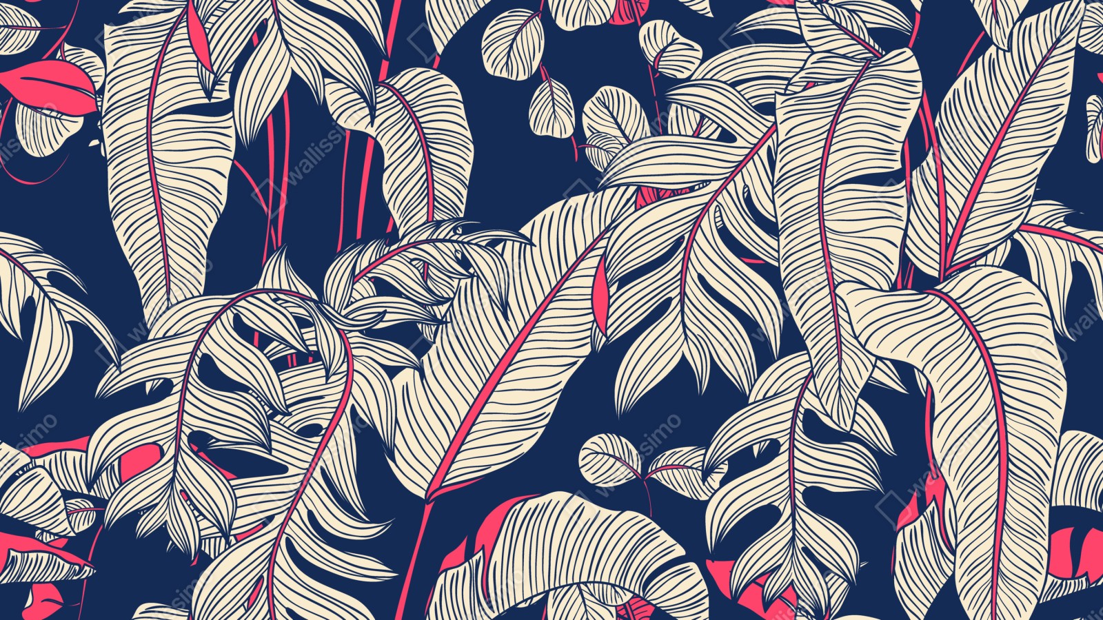 Kräftiges tropisches Blattmotiv in Marineblau, Creme und Rosa verleiht jedem Raum modernen botanischen Charme.