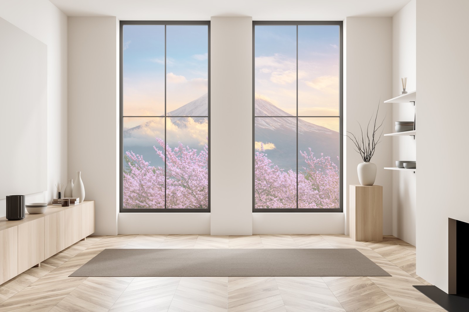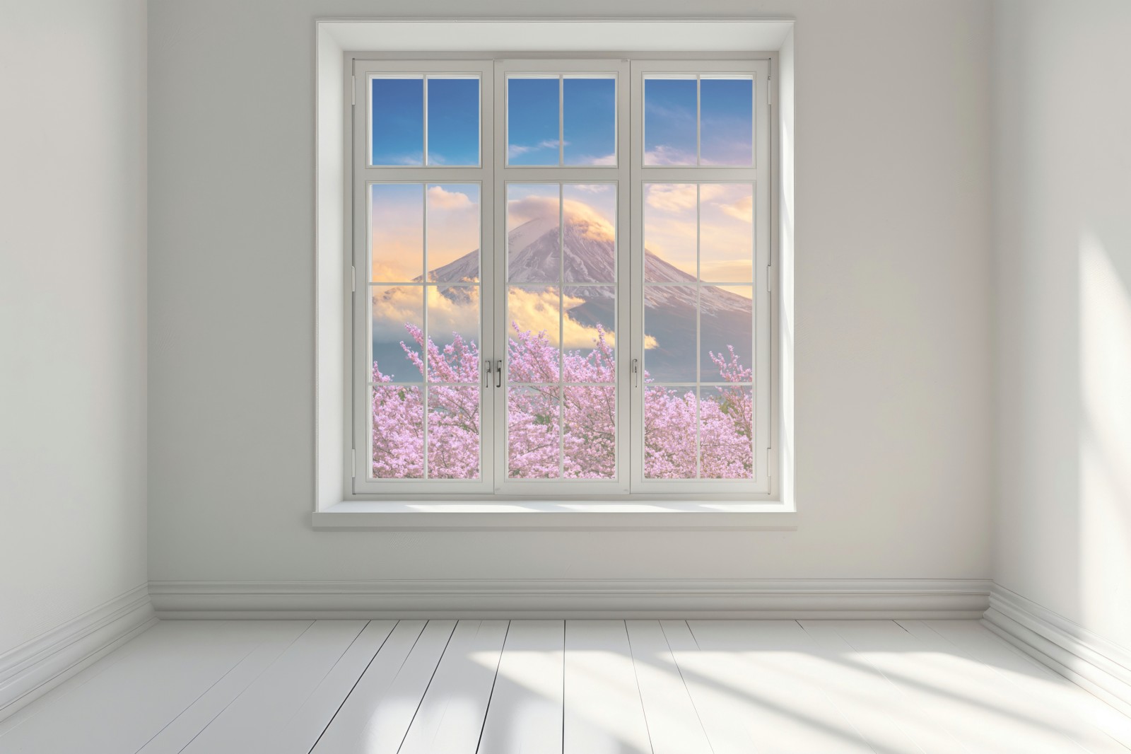 Ein atemberaubender blick auf Berg Fuji, eingerahmt von blühenden kirschblüten bei sonnenaufgang, bringt ruhige natürliche schönheit in jeden raum.