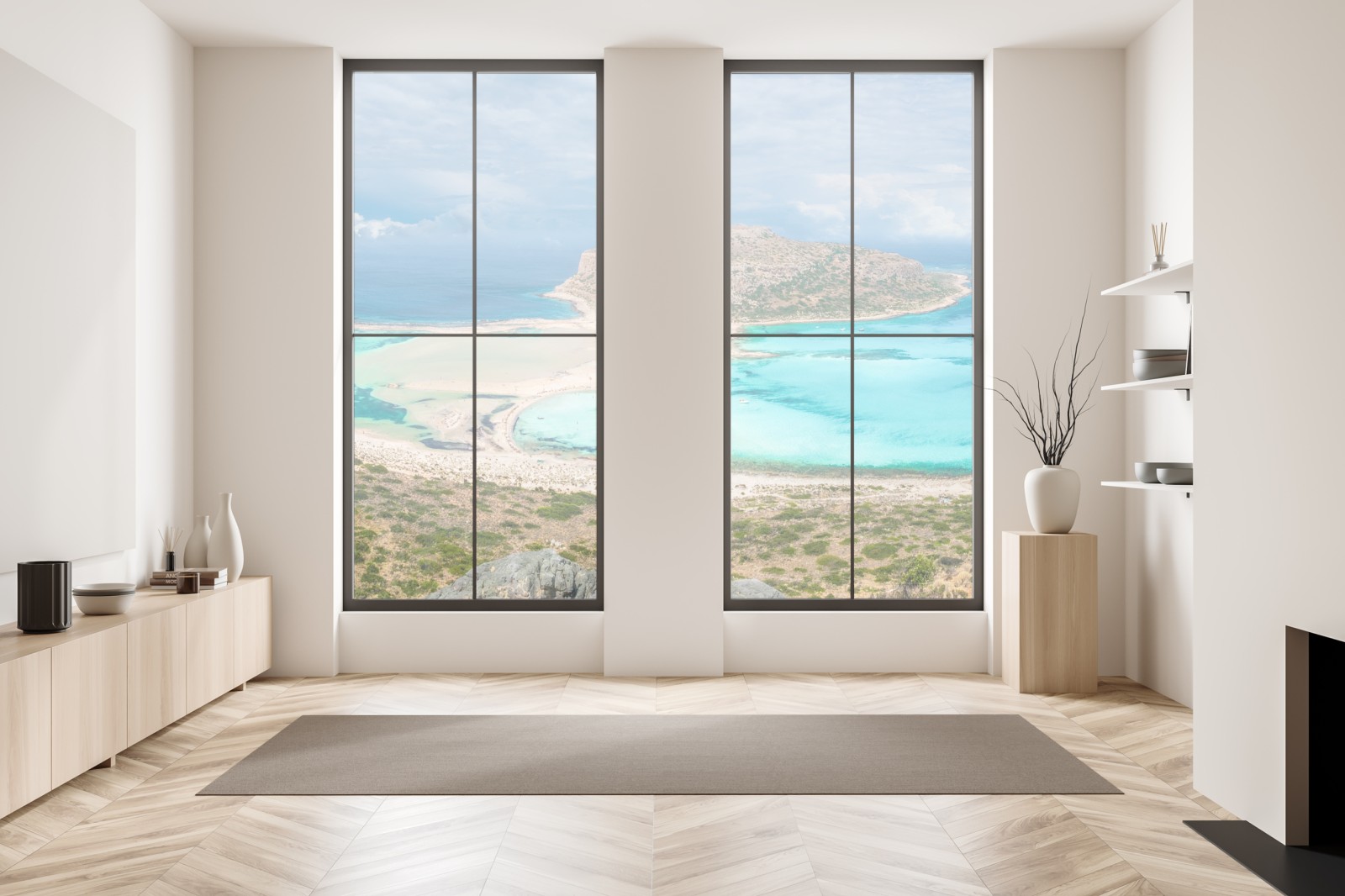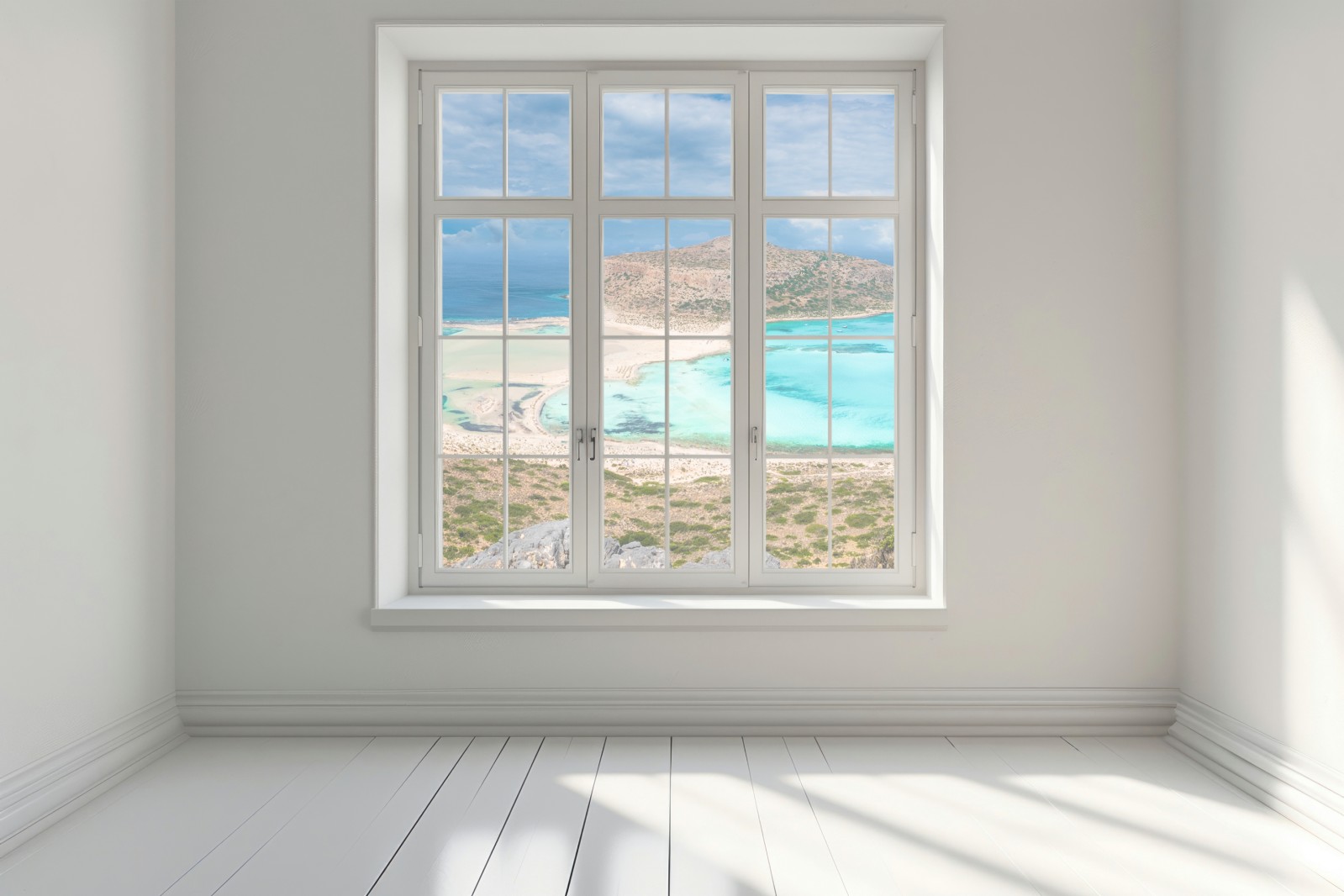 Holen Sie das sanfte Türkiswasser und die sonnigen Strände von Balos Lagoon in Ihren Raum mit diesem panoramischen Küstenmotiv, das Ruhe und Urlaubsgefühl vermittelt.