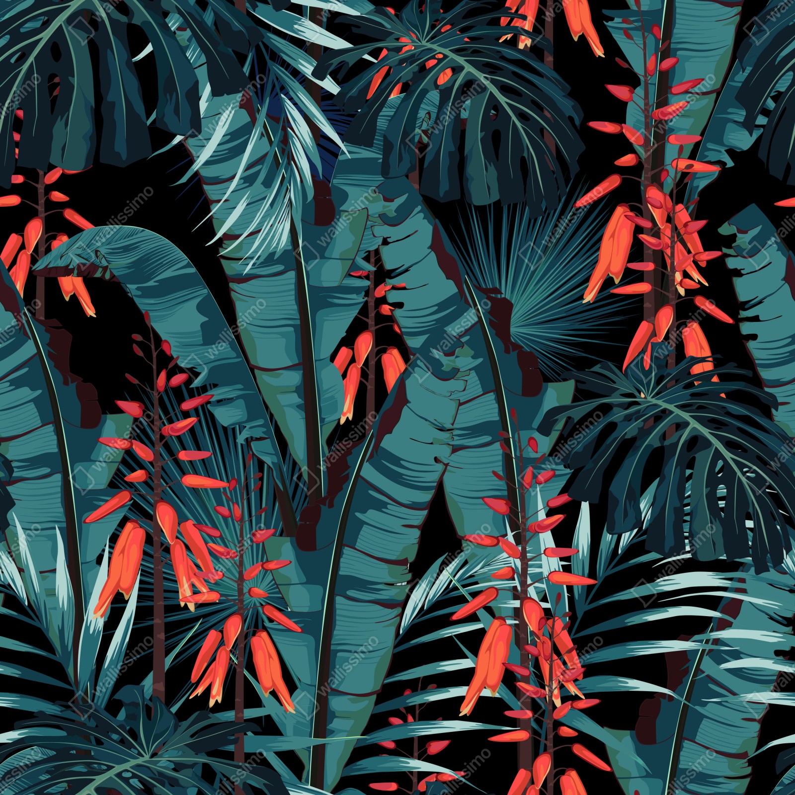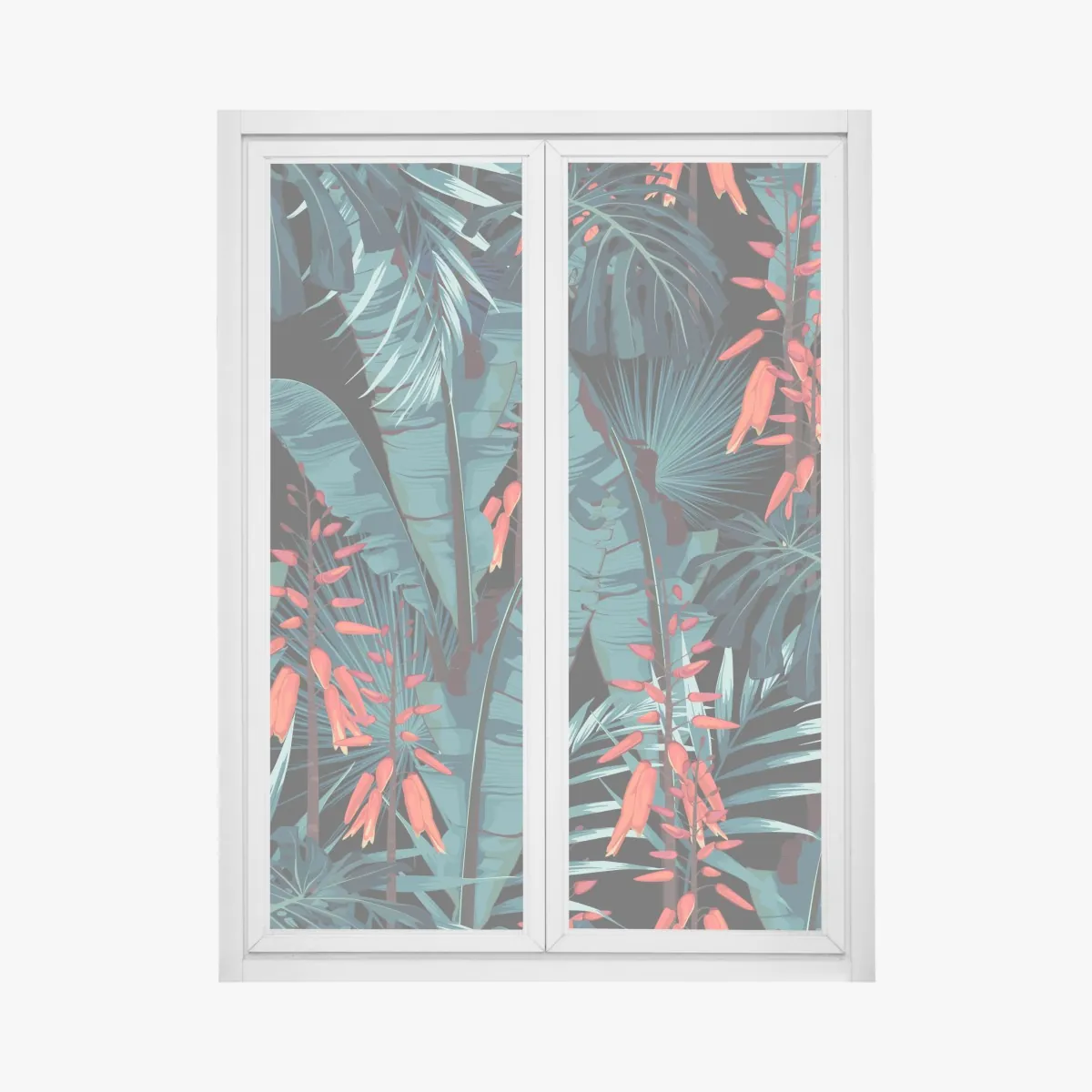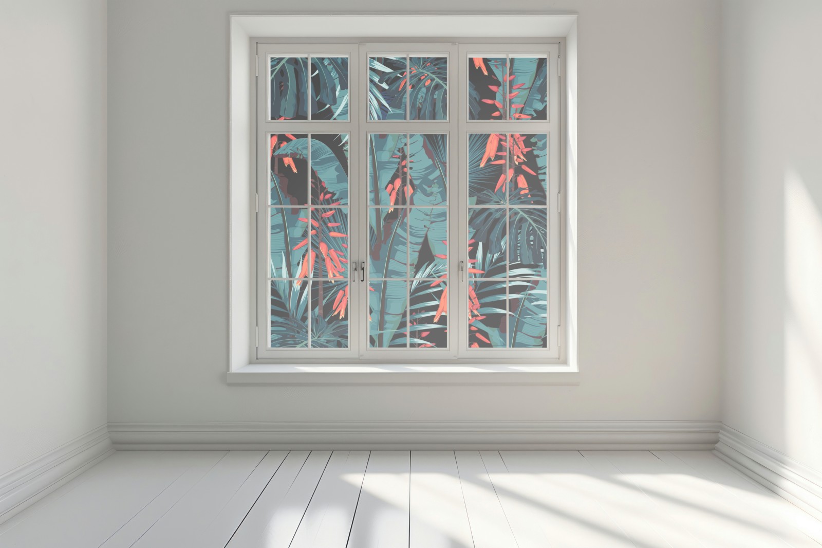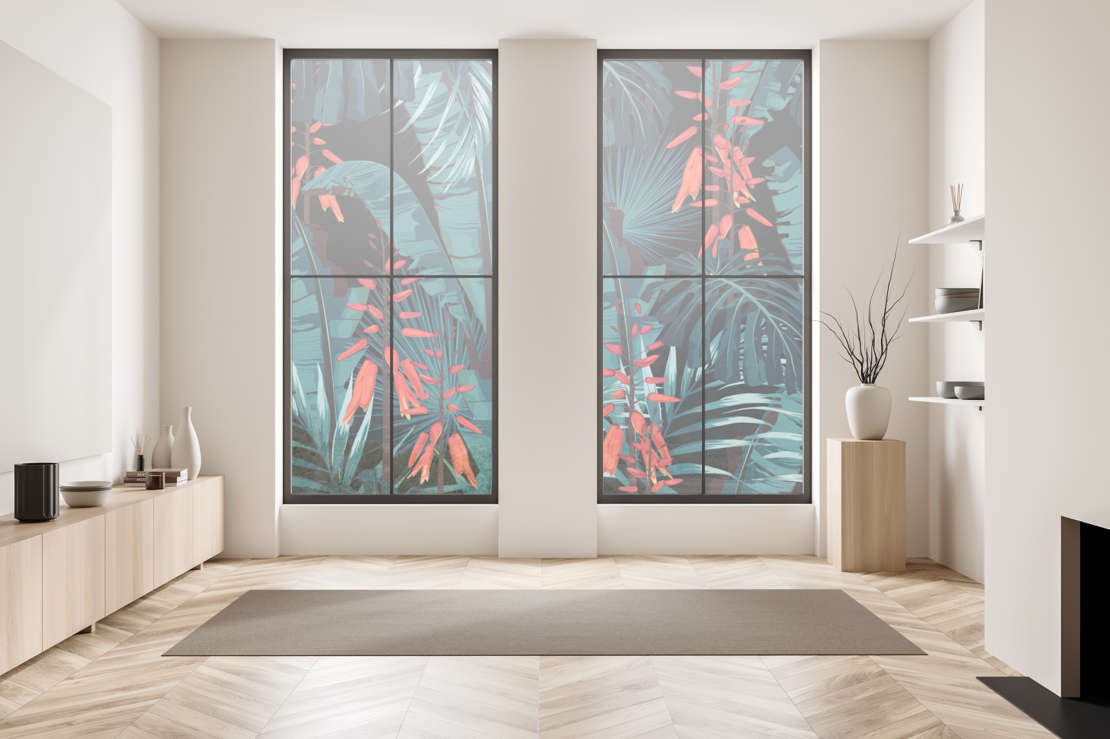 Kräftige tropische Blätter in türkis- und koralltönen schaffen einen markanten, modernen Akzent im Raum.