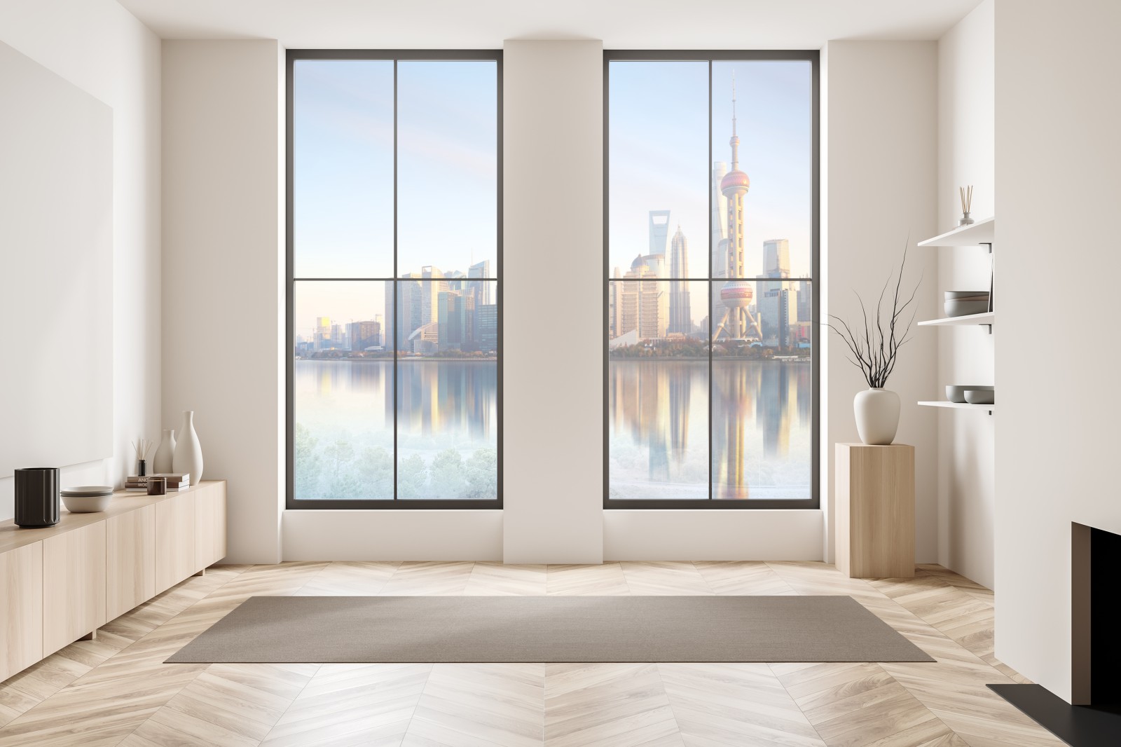 Eine ruhige Panoramaansicht der modernen Skyline von Shanghai, reflektiert im ruhigen Wasser und ideal für urbanes Ambiente.