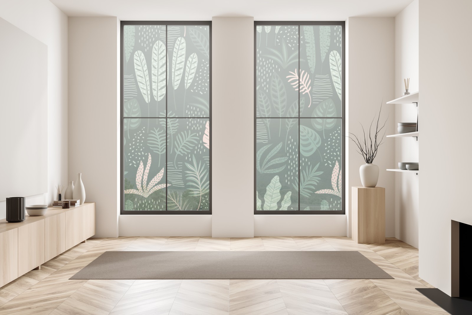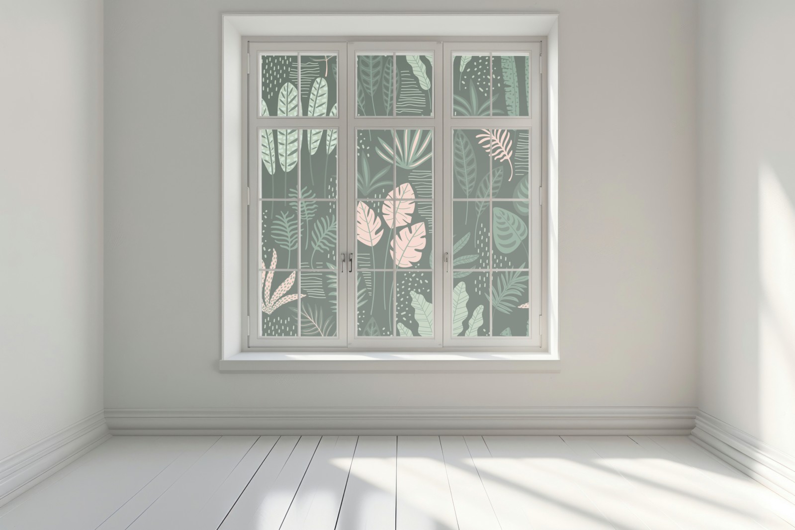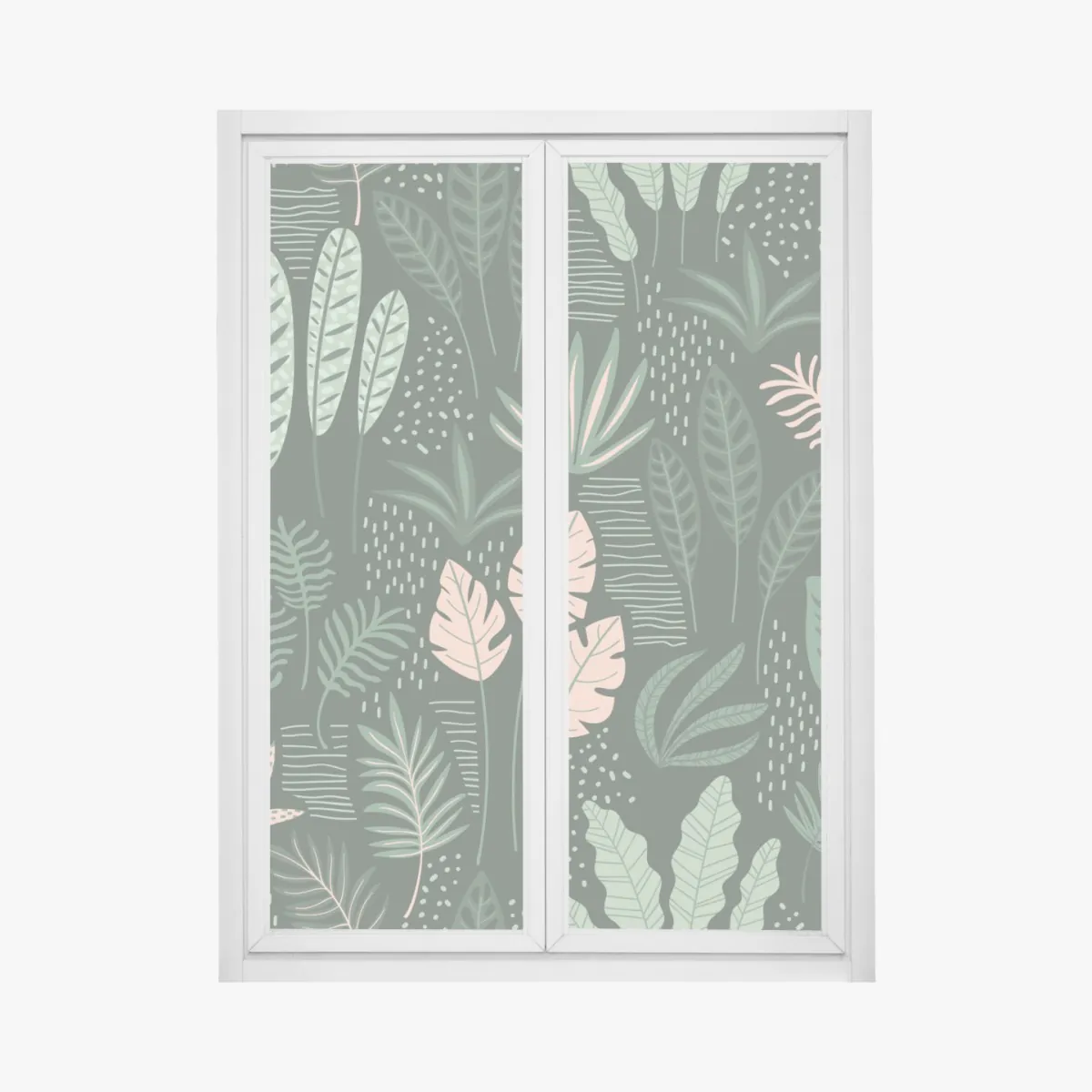 Fensteraufkleber tropisches blättermuster in sanften grüntönen und rosa