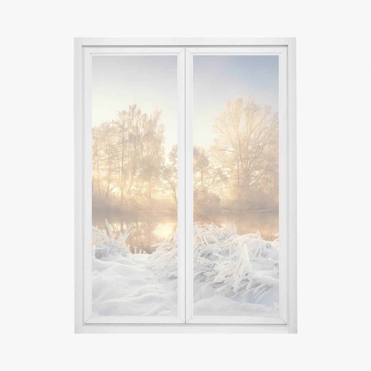 Fensteraufkleber Goldener wintersonnenaufgang über dem frostigen fluss