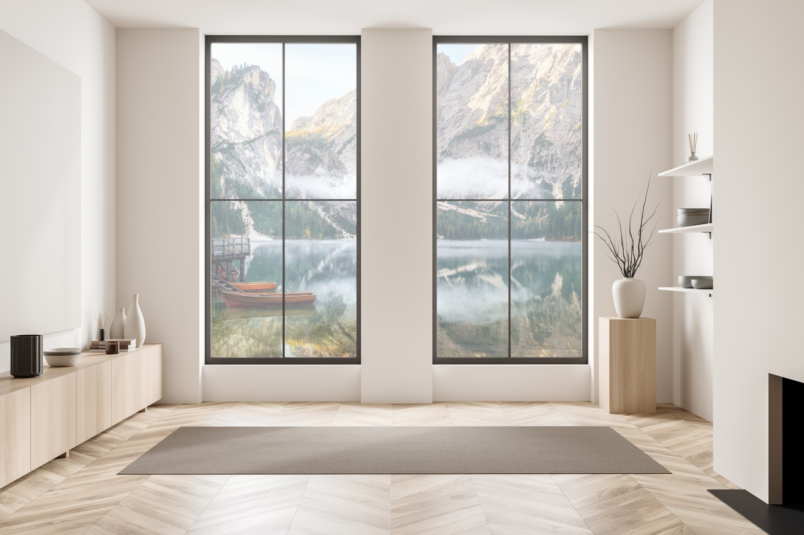 ein ruhiger alpensee im morgendunst mit spiegelnden berggipfeln und dichter bewaldung, perfekt zur schaffung einer natürlichen atmosphäre im raum.