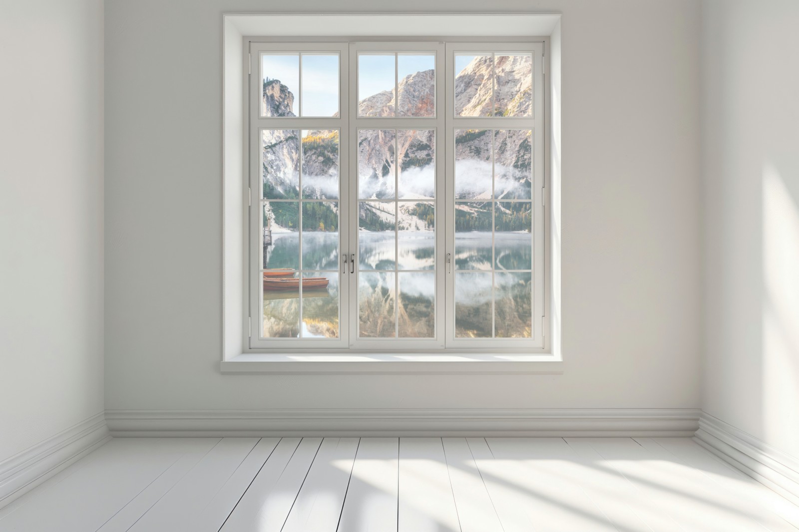 Fensteraufkleber nebliger alpensee mit spiegelung