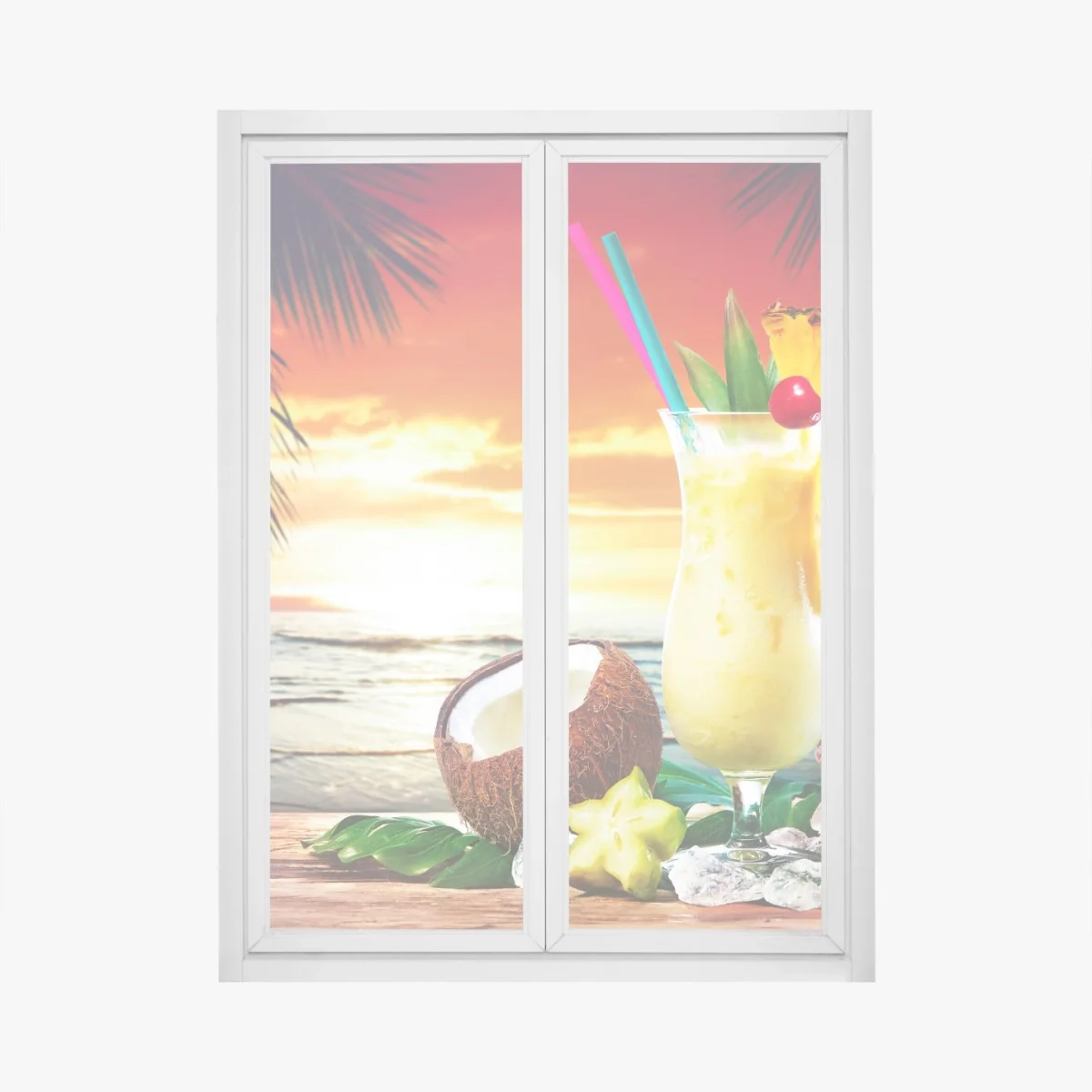 Fensteraufkleber Tropischer kokos-ananas-cocktail am strand bei sonnenuntergang
