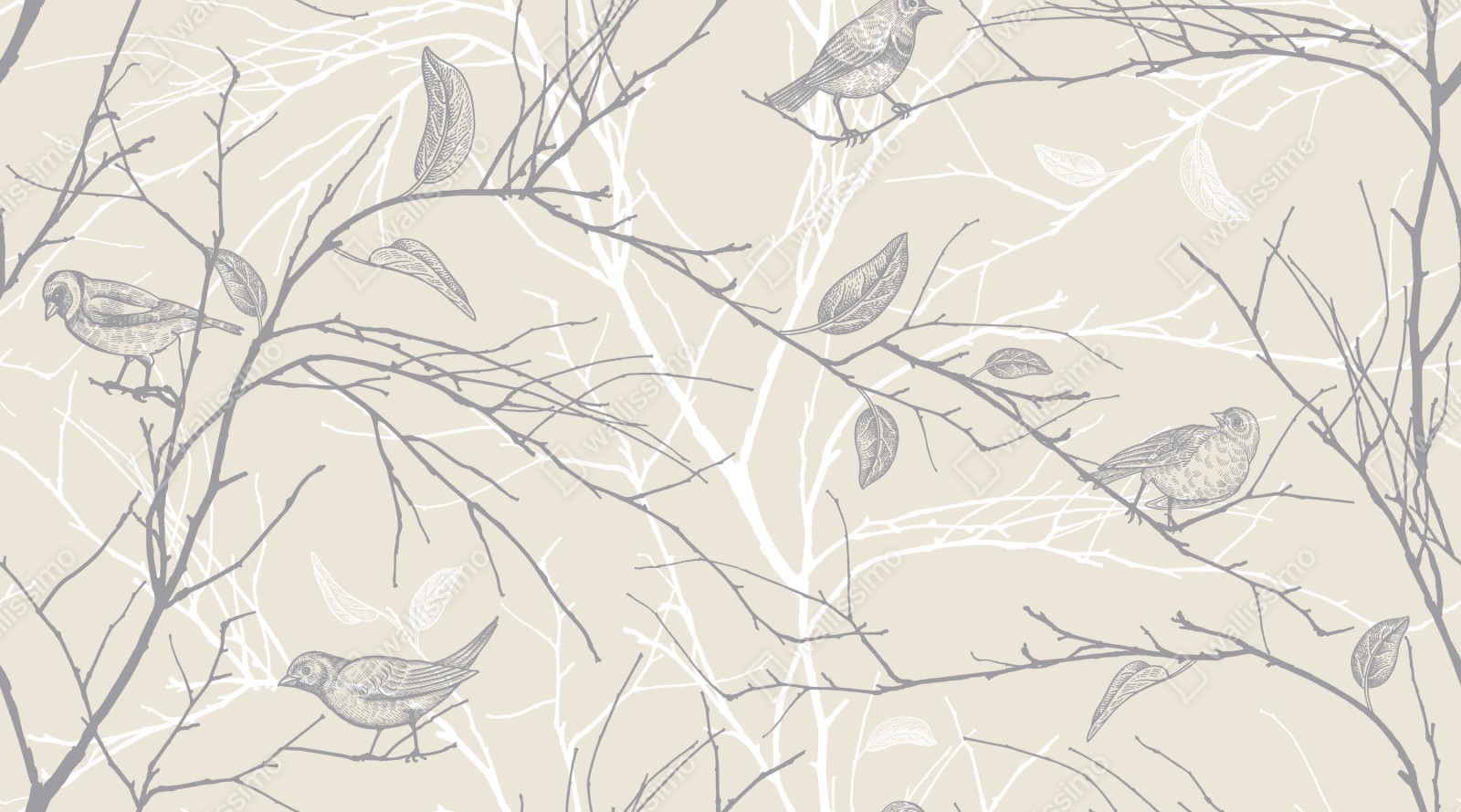 zartes muster mit vögeln und ästen in einer dezenten beige-grauen palette, das eine ruhige, natürliche atmosphäre schafft.