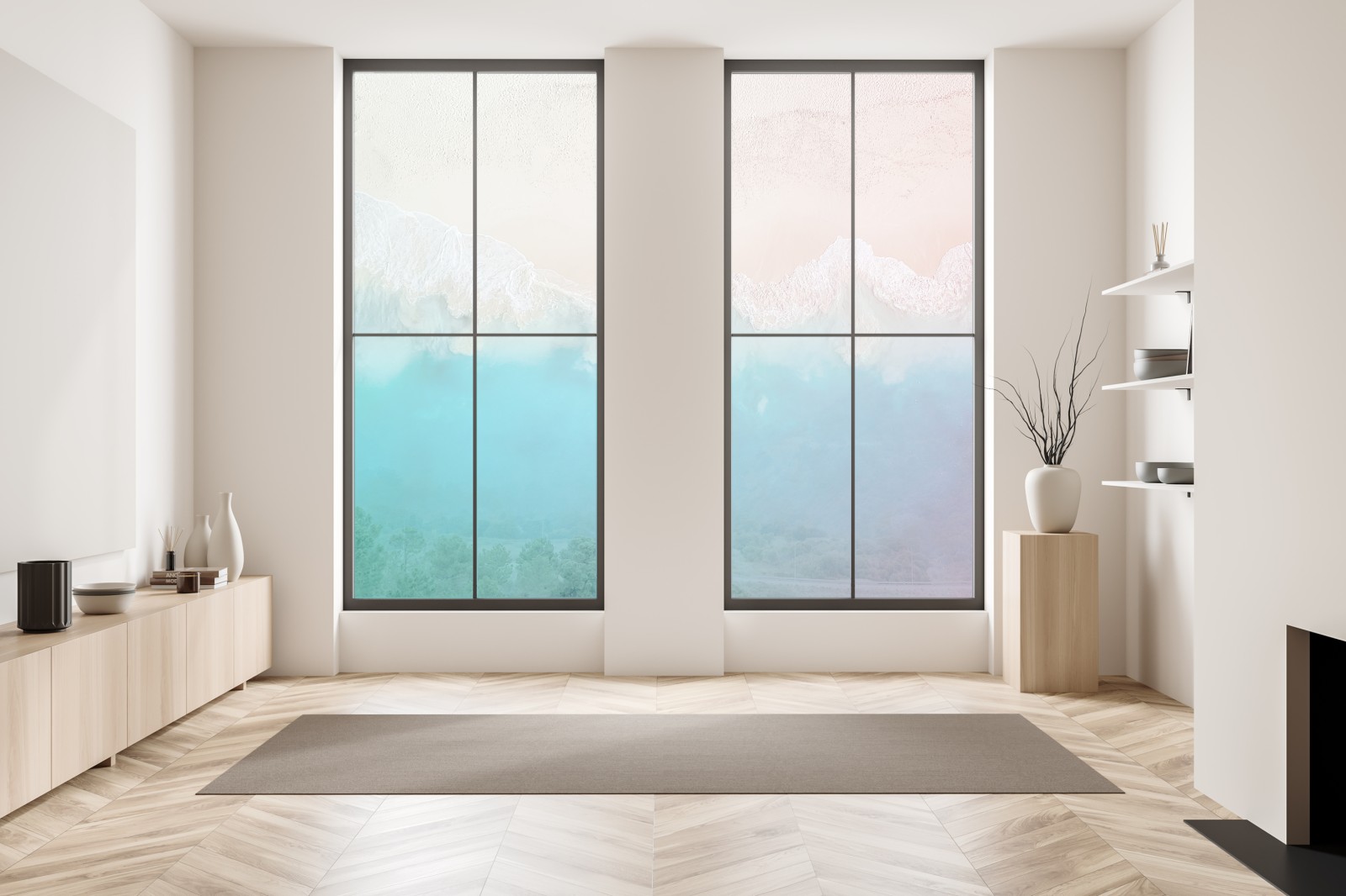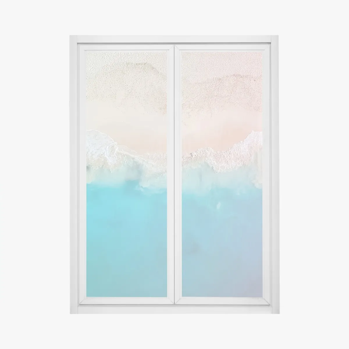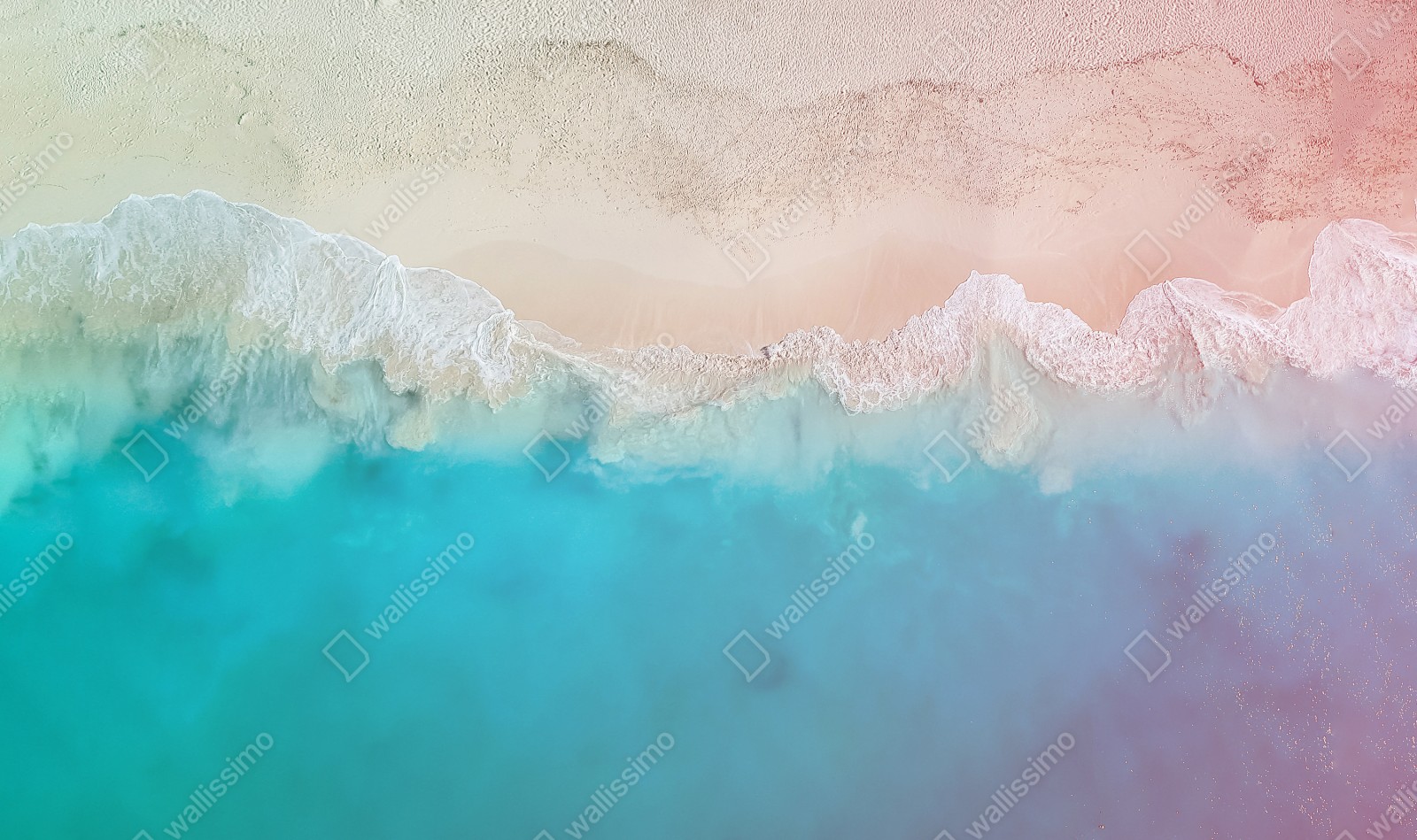 Beruhigende Luftaufnahme eines pastellfarbenen Strandes mit türkisfarbenem Meer und sanften Wellen, ideal für moderne Wohnräume.