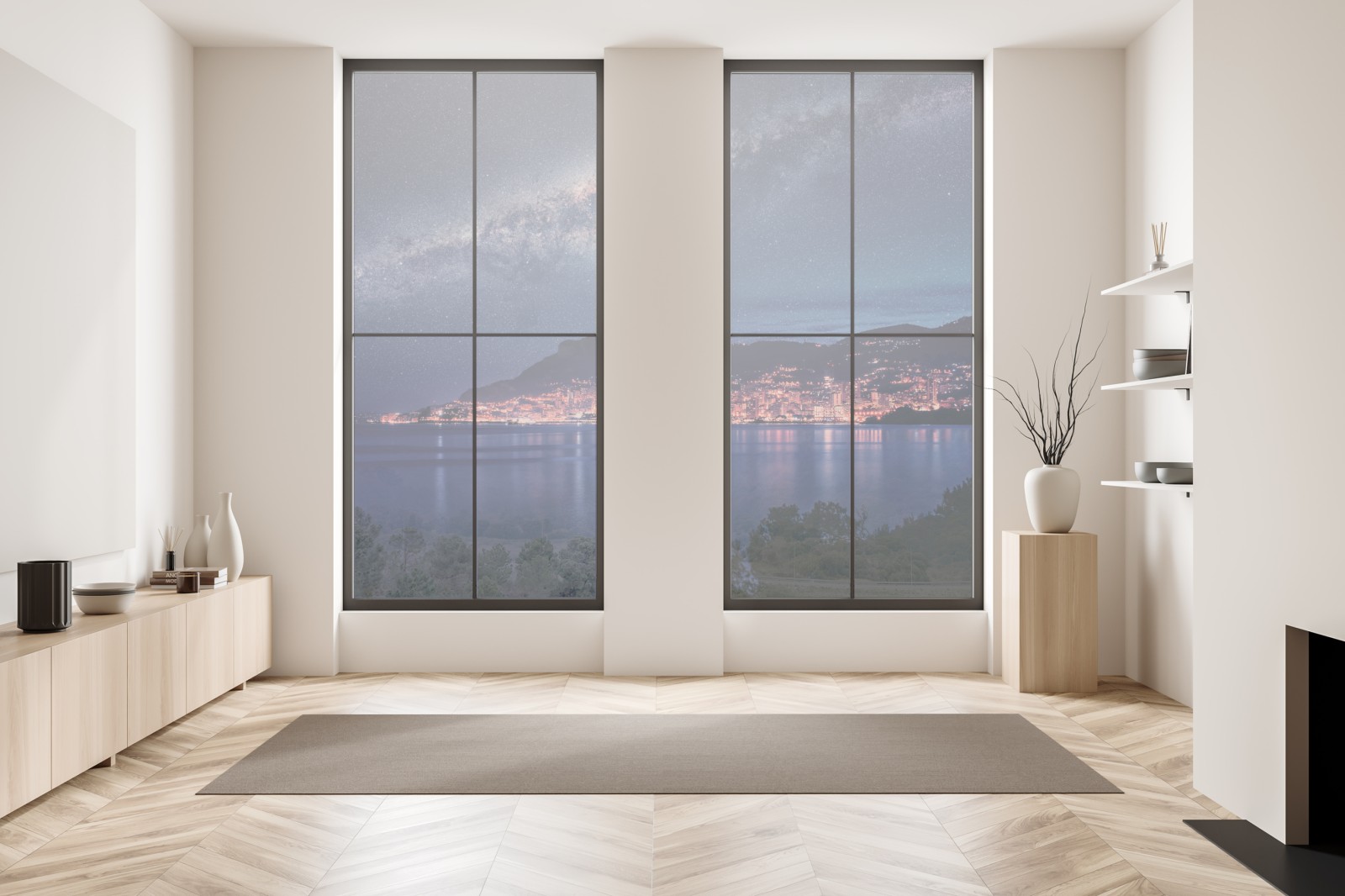 Atemberaubende nächtliche stadtlandschaft, in der die Milchstraße über einer leuchtenden Küstenlinie spannt und jedem Raum Tiefe und Atmosphäre verleiht.