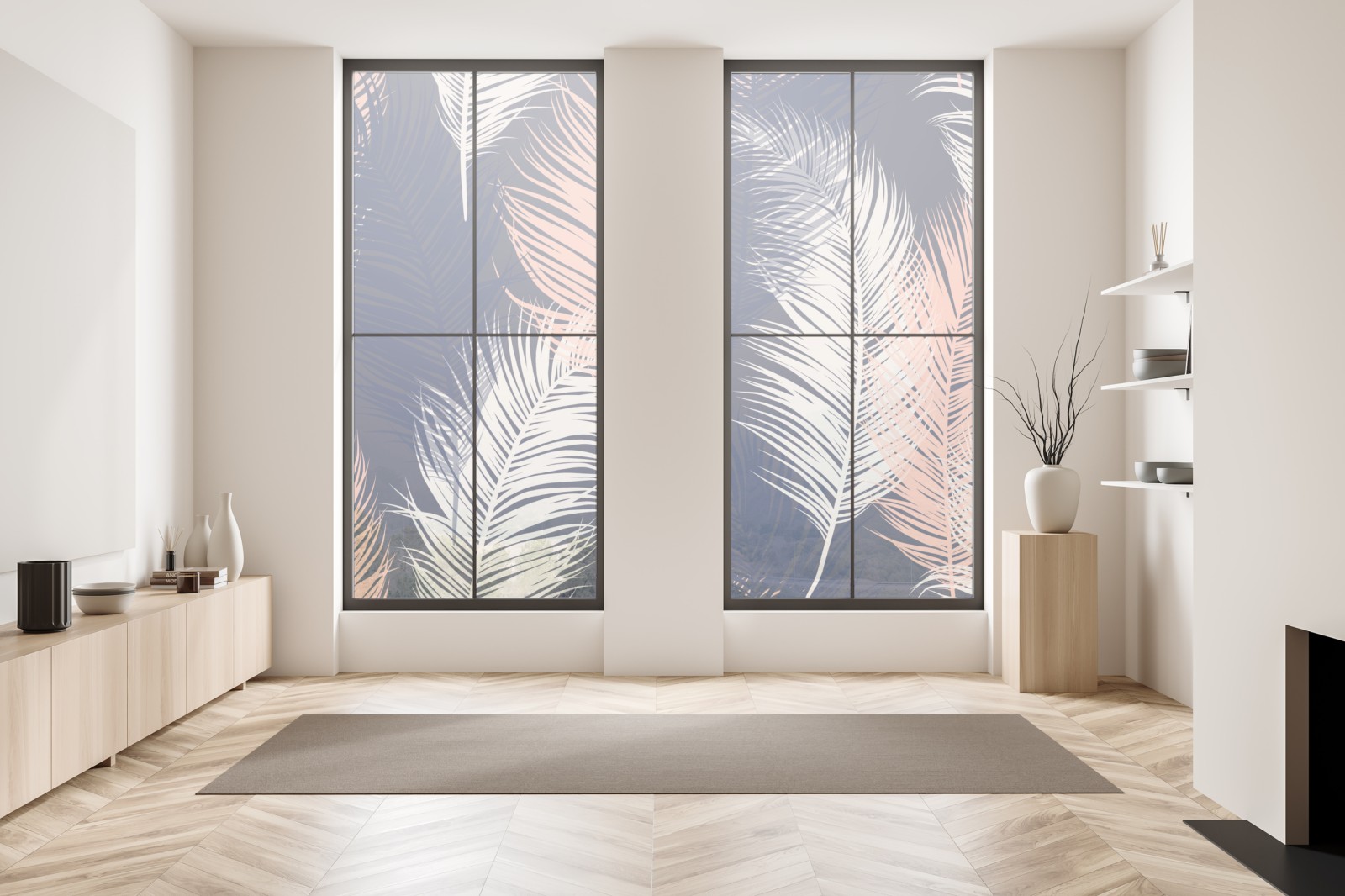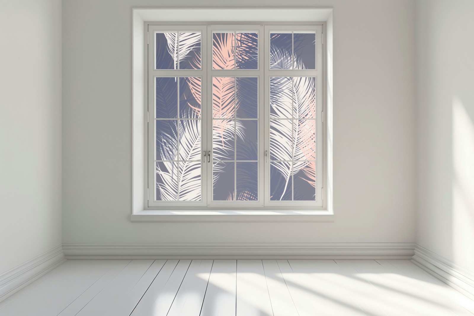 Elegantes Federmuster in Marineblau und Rosa verleiht dem Raum zarten, boho-inspirierten Charme und Ruhe.