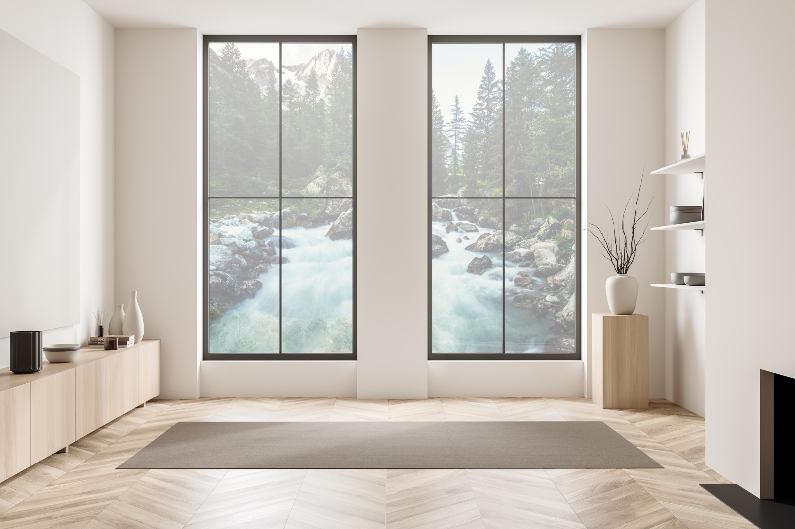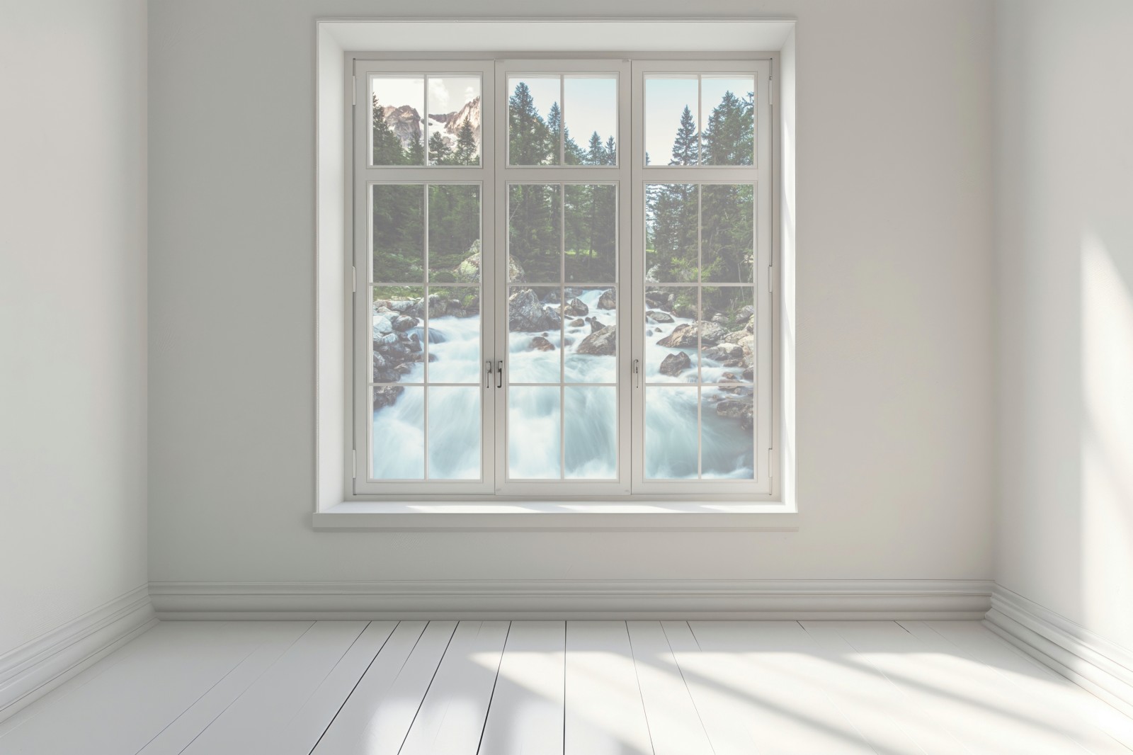 Bringen Sie die ruhige Energie eines Gebirgsflusses in Ihren Raum mit diesem lebendigen Alpenpanorama mit rauschendem Wasser, schroffen Gipfeln und dichtem Wald.