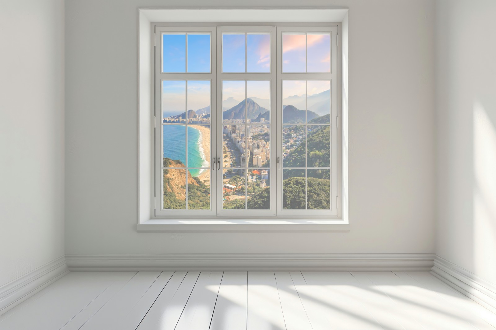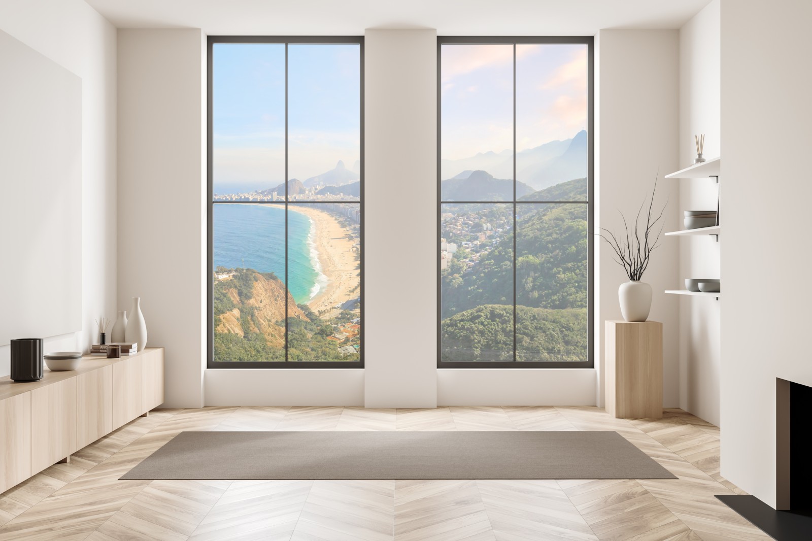 Atemberaubender Luftblick auf die Strände von Copacabana und Ipanema bei Sonnenuntergang, der lebendige Küstenfarben und eine panoramische Stadtszene in Ihr Zuhause bringt.
