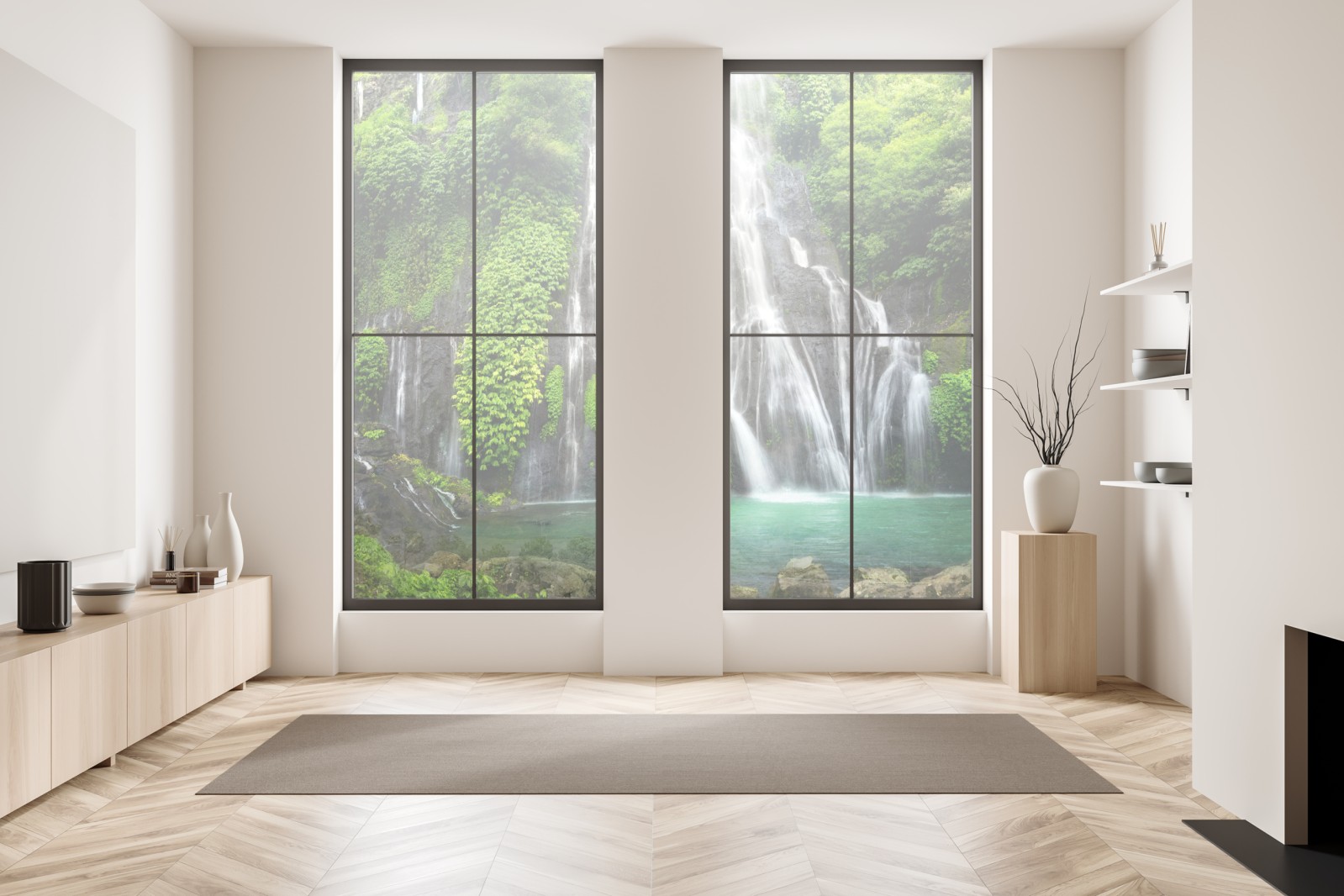 Ein ruhiger wasserfall, der in türkisfarbenen pool stürzt, umgeben von üppigem grünem dschungel, perfekt, um naturnahe atmosphäre ins interieur zu bringen.