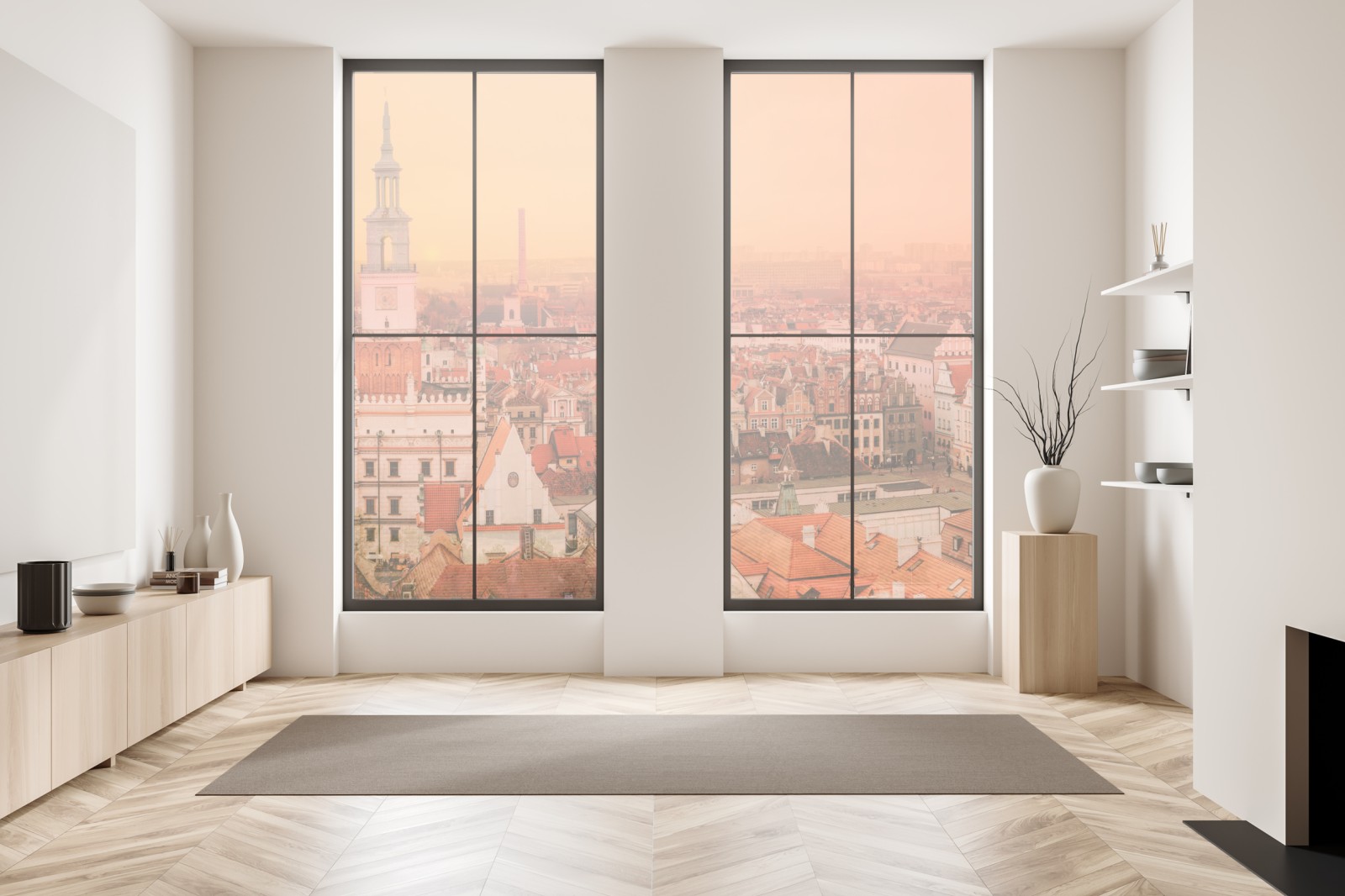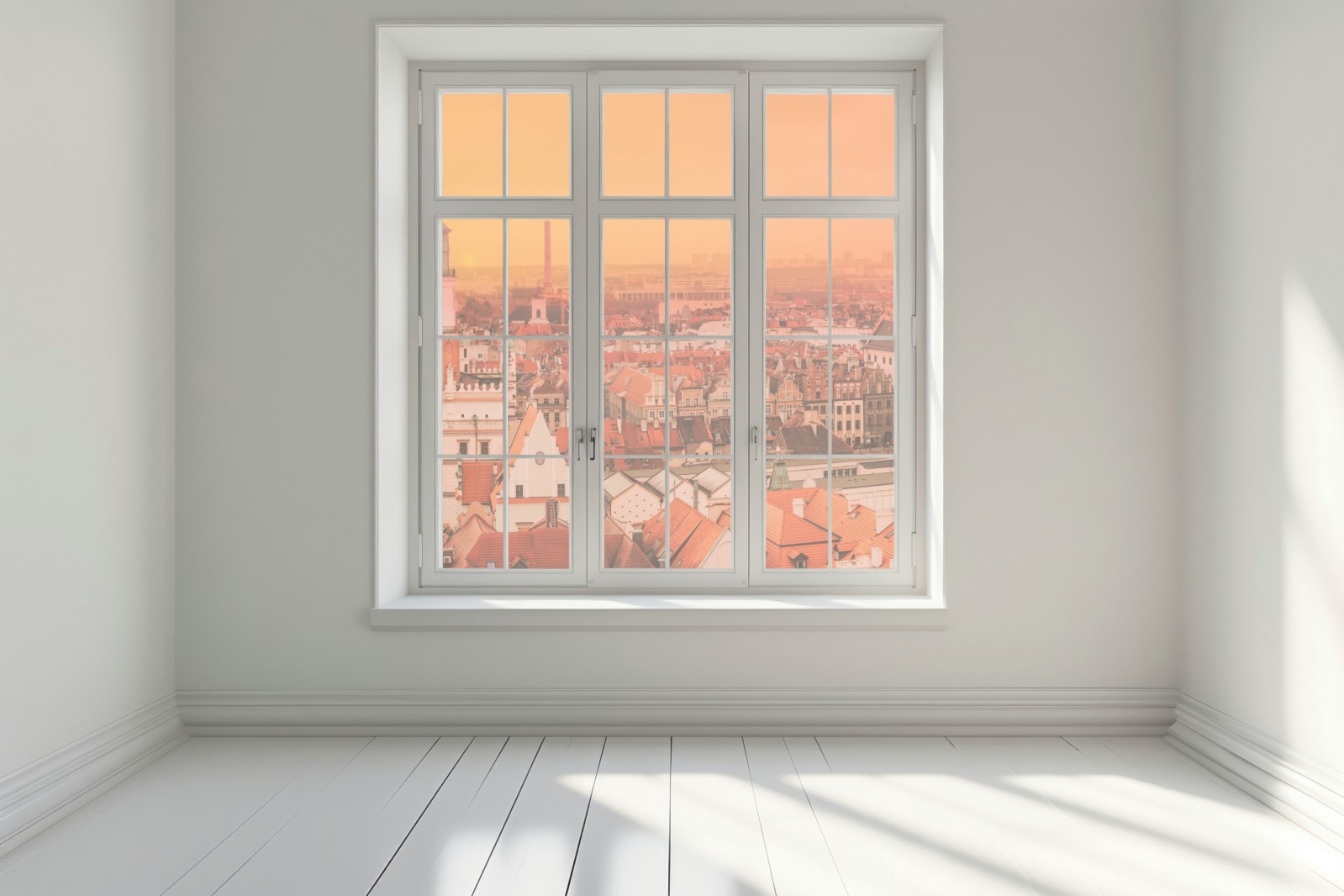 Fensteraufkleber warmer sonnenuntergang über historischen stadtdächern