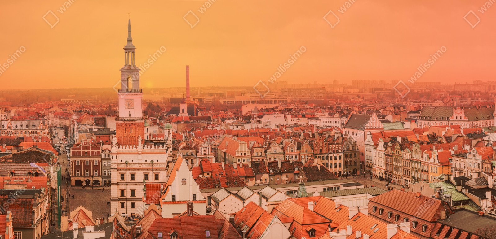 Warmer Panoramablick auf historische Stadtdächer bei Sonnenuntergang, perfekt um Innenräume mit Vintage-Charme zu bereichern.