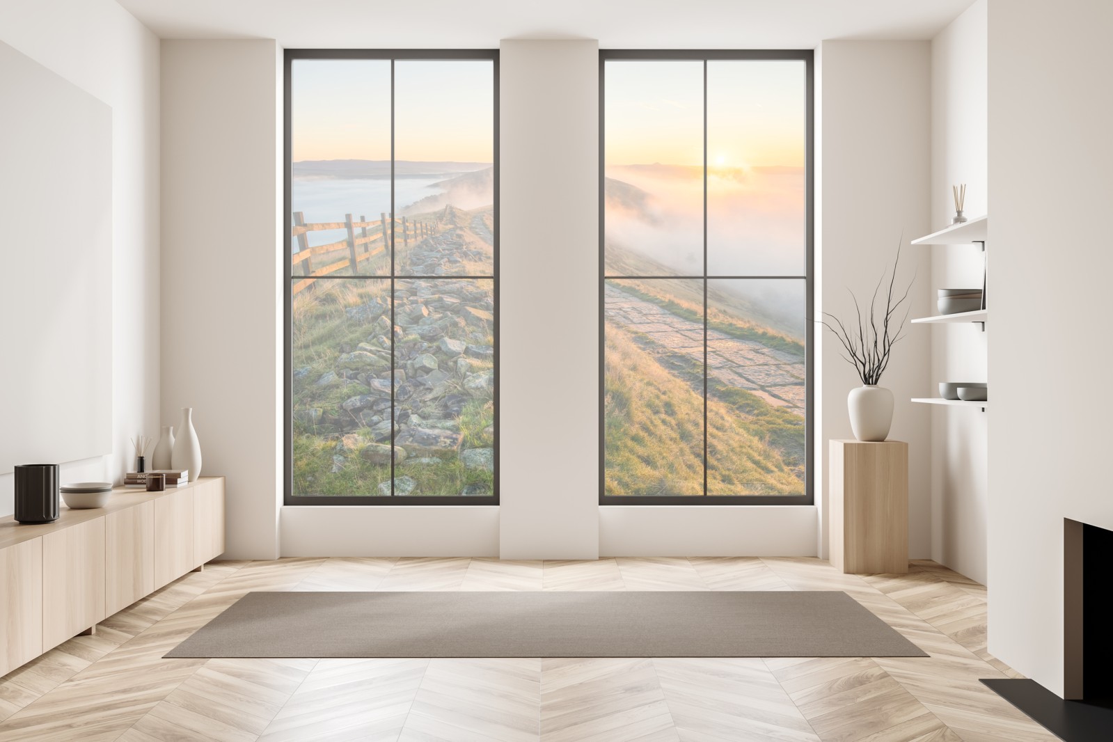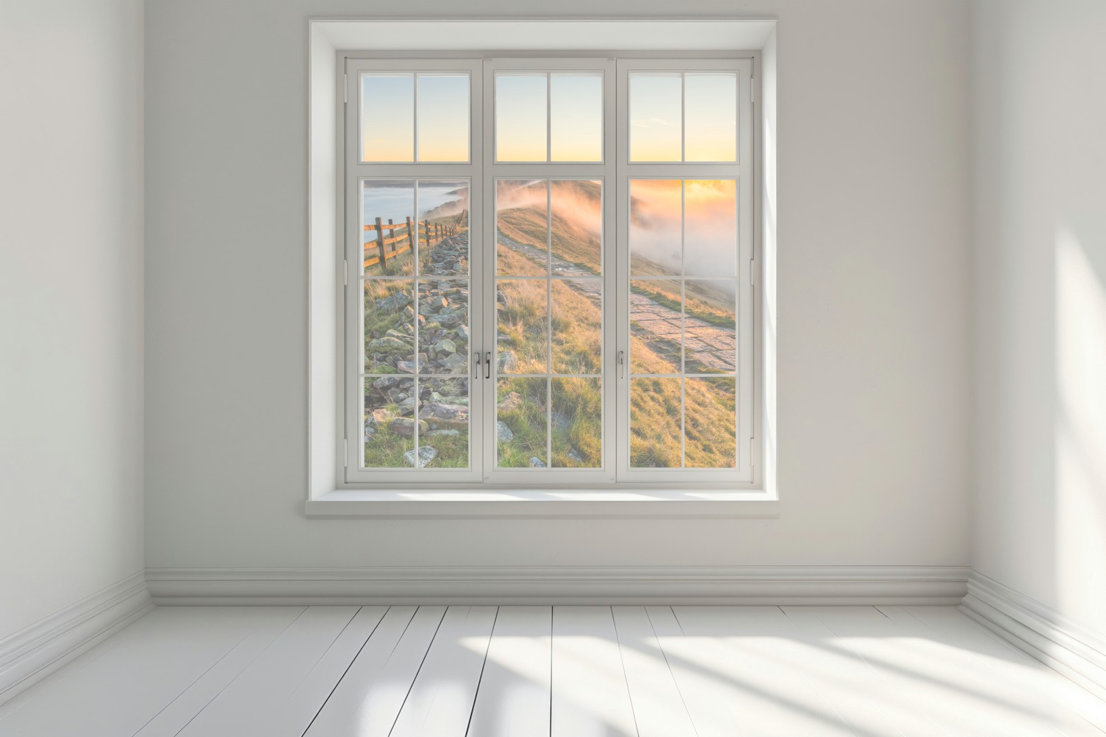 Fensteraufkleber sonnenaufgang über einem nebligen bergrücken mit steinweg