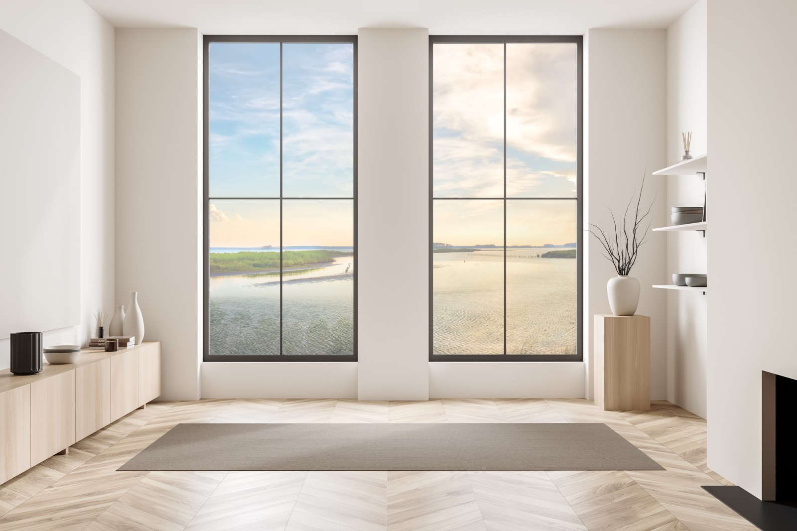 Ein ruhiger Sonnenuntergang über der Chesapeake-Bucht mit einem einsamen Reiher auf einer Marschinsel, perfekt zur Gestaltung naturnaher Räume.