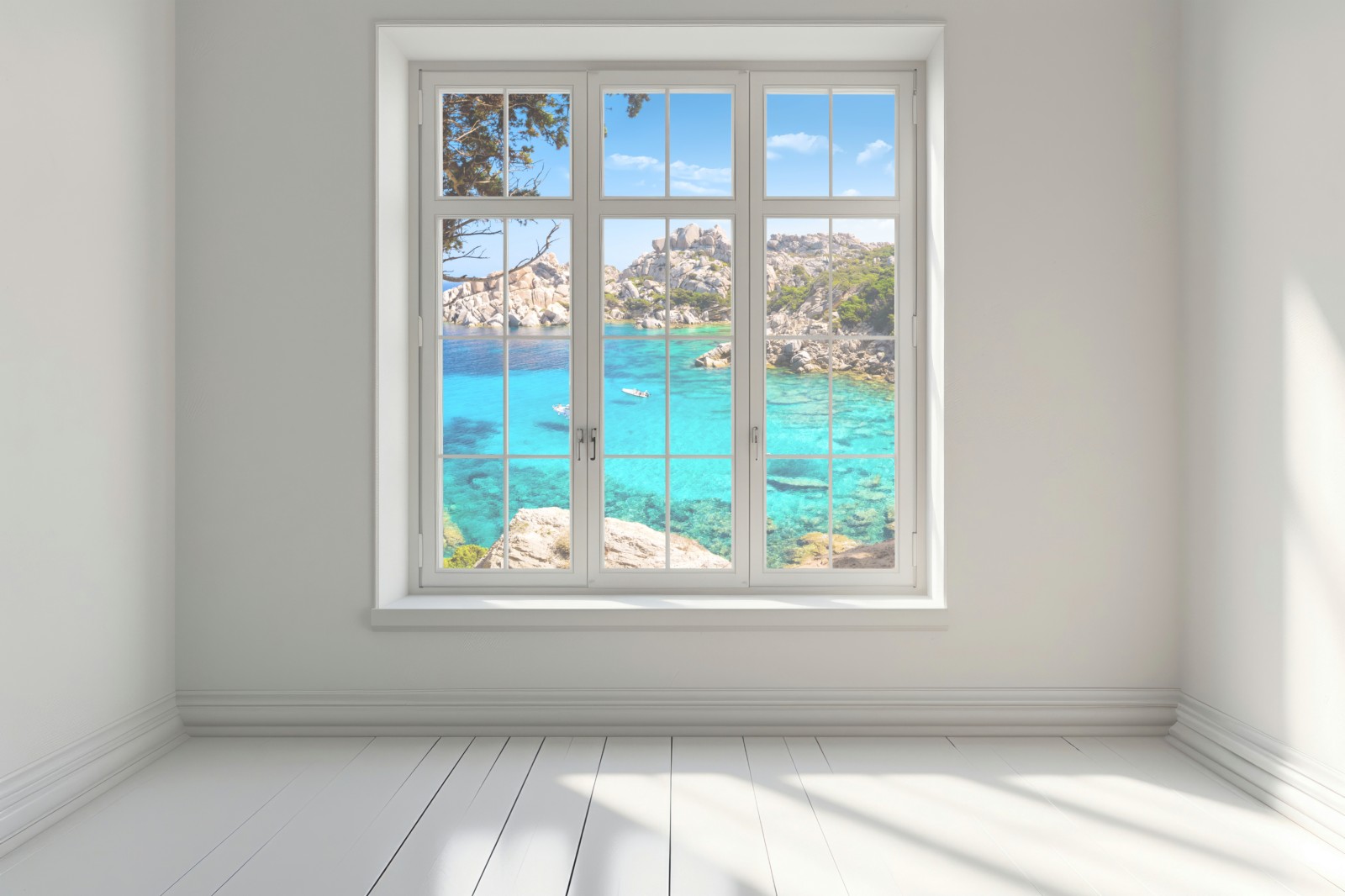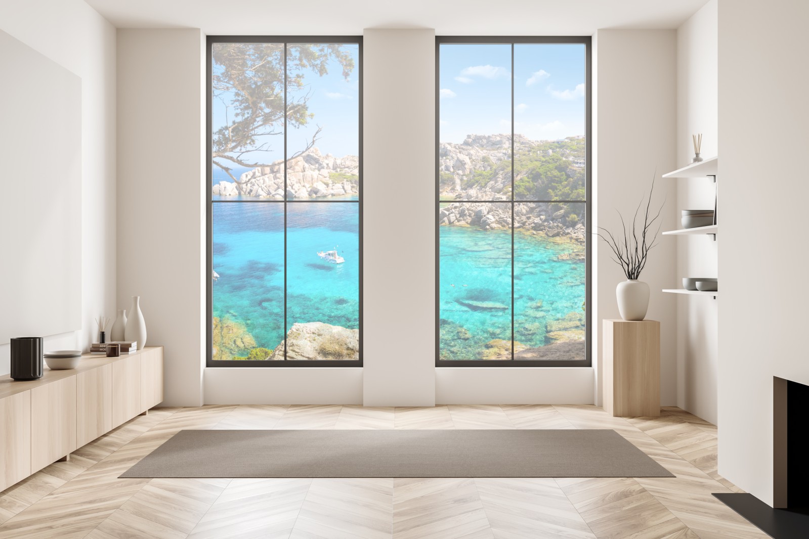 Atemberaubender Panoramablick auf eine türkisfarbene Bucht und felsige Küste, der jedem Raum eine beruhigende Meeresatmosphäre verleiht.