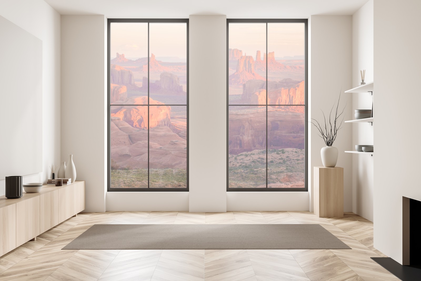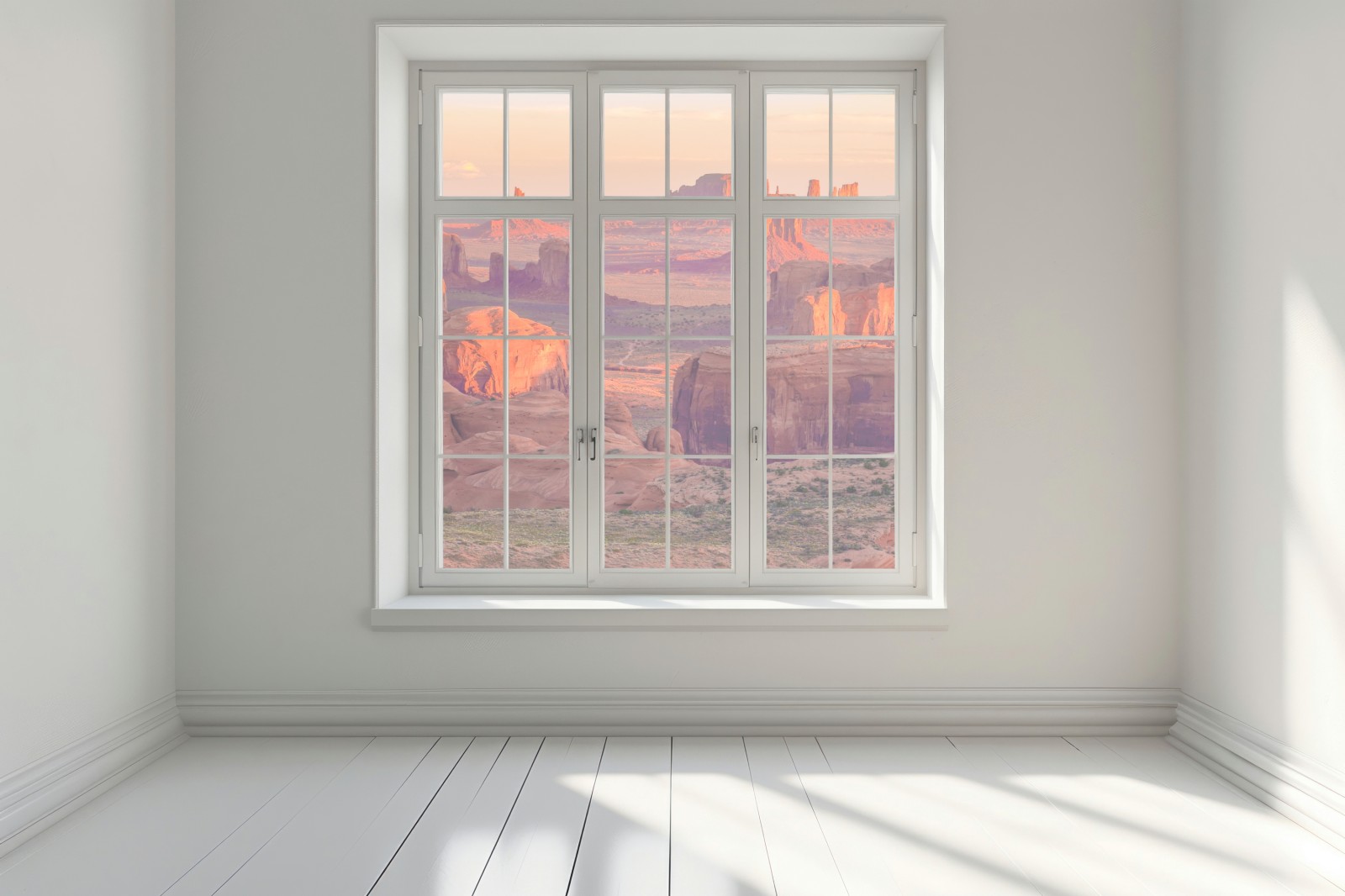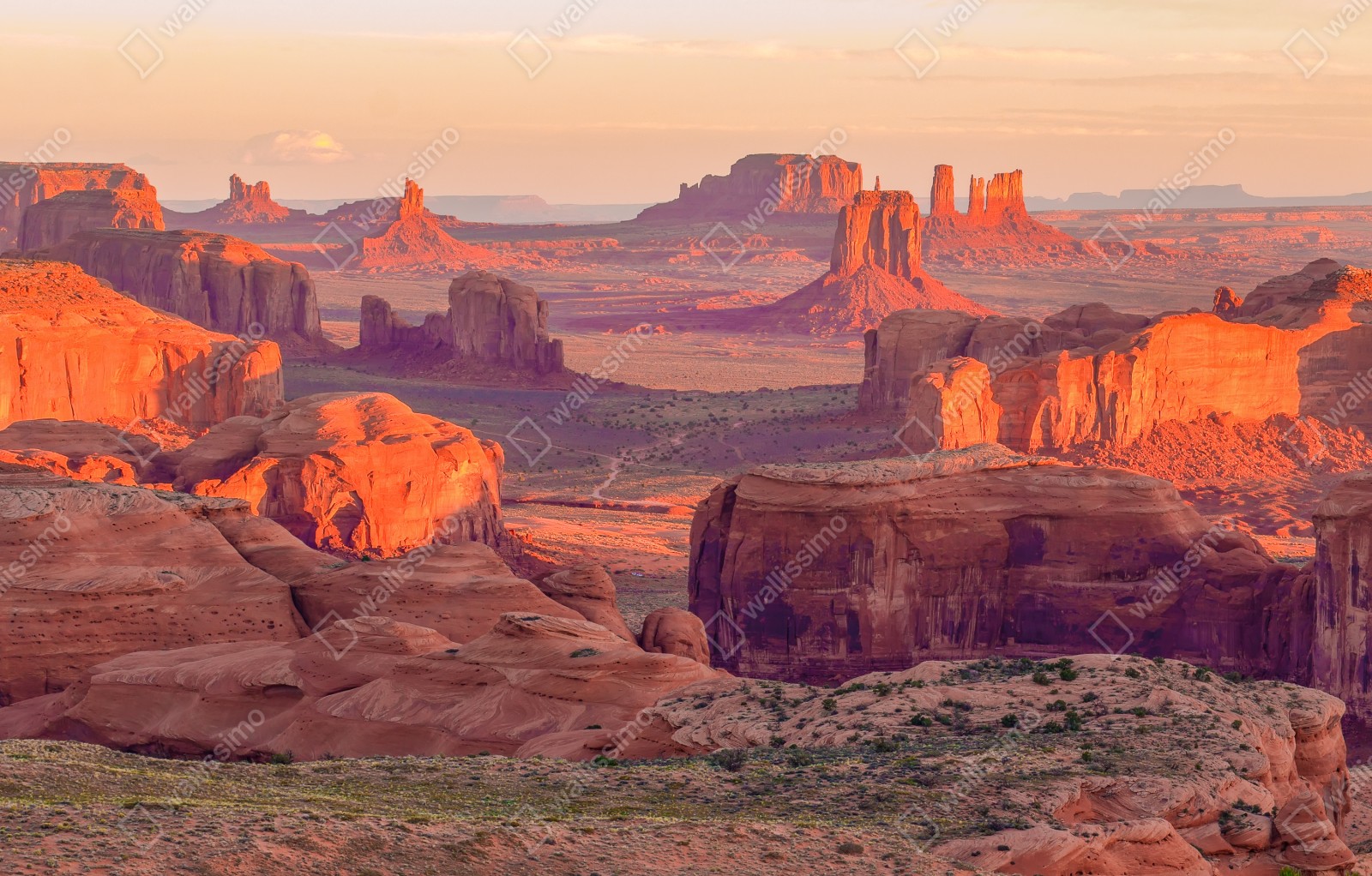 Atemberaubende Panoramaansicht des Monument Valley zur goldenen Stunde, bringt warme Wüstenfarben und dramatische Felsformationen in Ihren Raum.