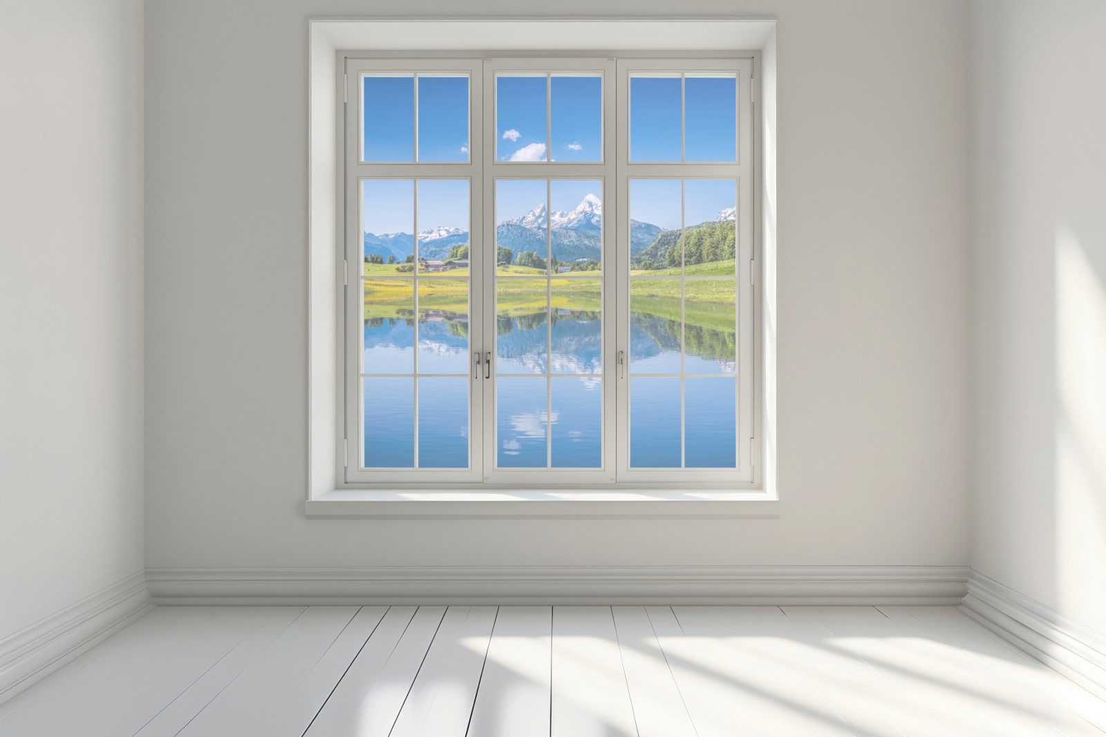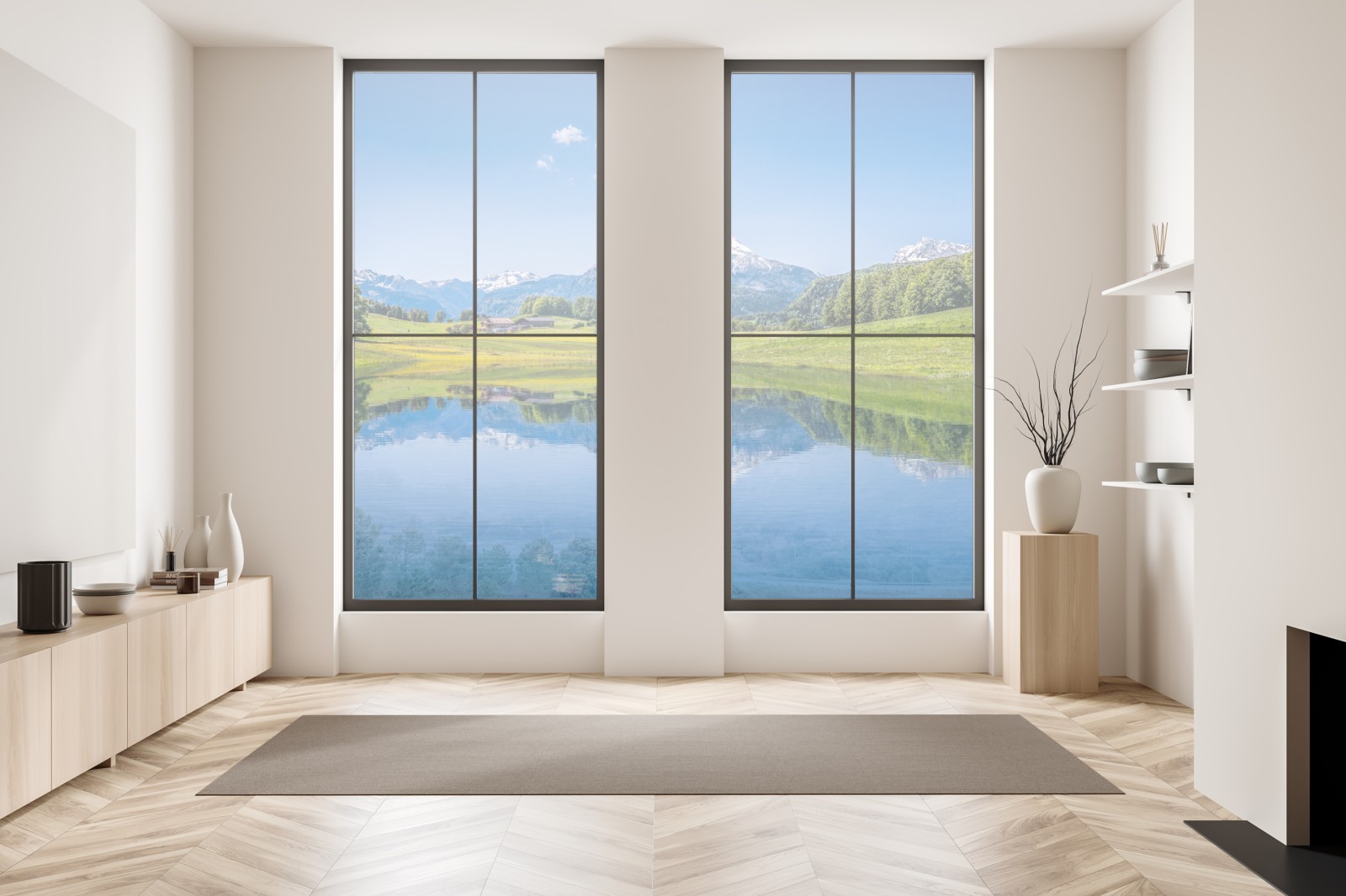 Eine ruhige Alpenlandschaft mit schneebedeckten Gipfeln, die sich in einem klaren See spiegeln und dem Raum natürliche Gelassenheit verleihen.
