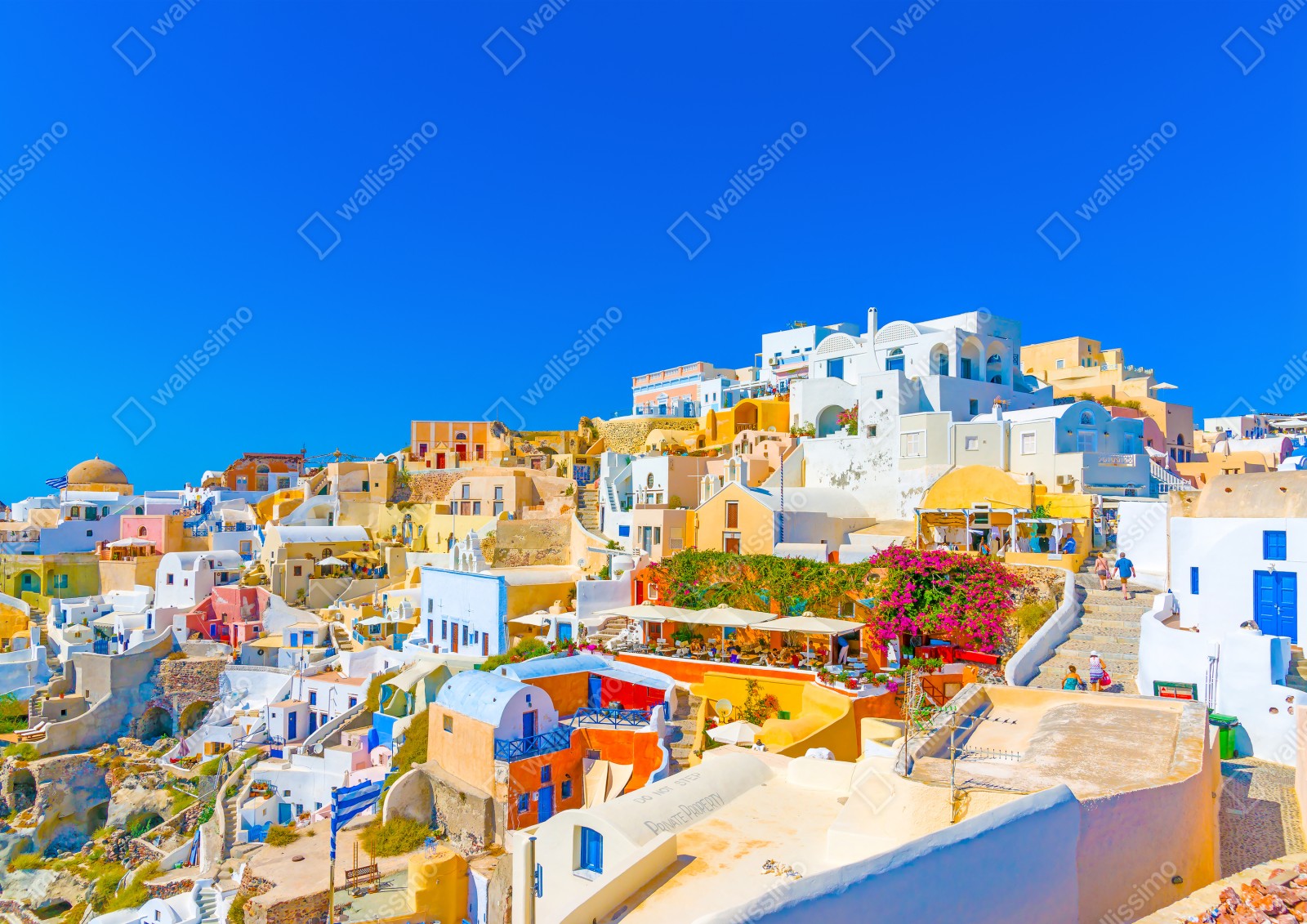 Lebendige Ansicht der weiß getünchten Häuser von Oia vor dem strahlend blauen Himmel bringt mediterranen Charme und Ruhe in jeden Raum.