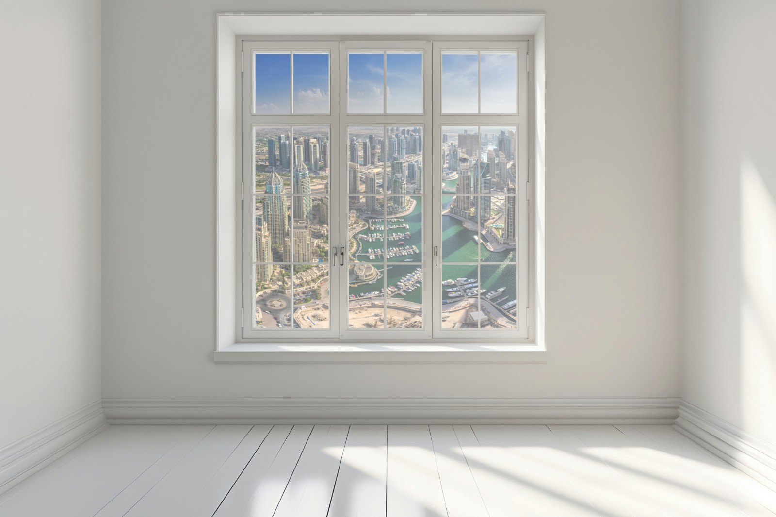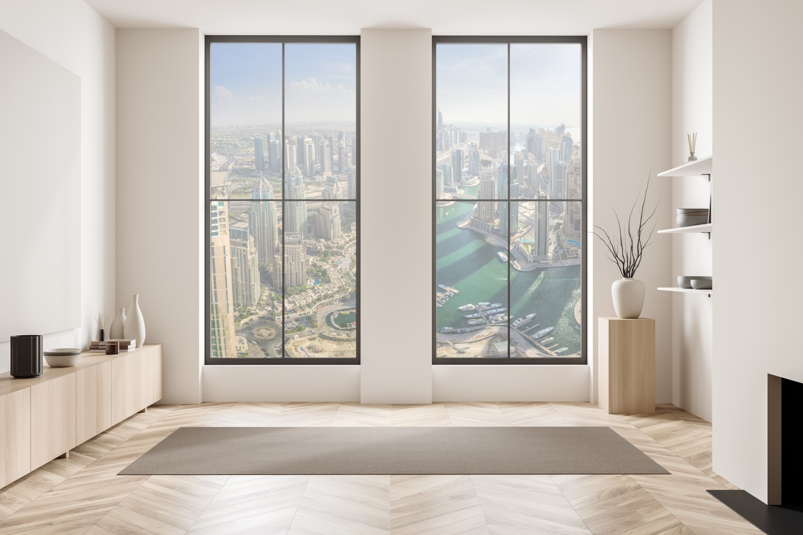 Beeindruckende Panoramaaufnahme von Dubai Marina mit türkisfarbenem Wasser und modernen Wolkenkratzern, perfekt um jedem Raum urbanen Stil zu verleihen.