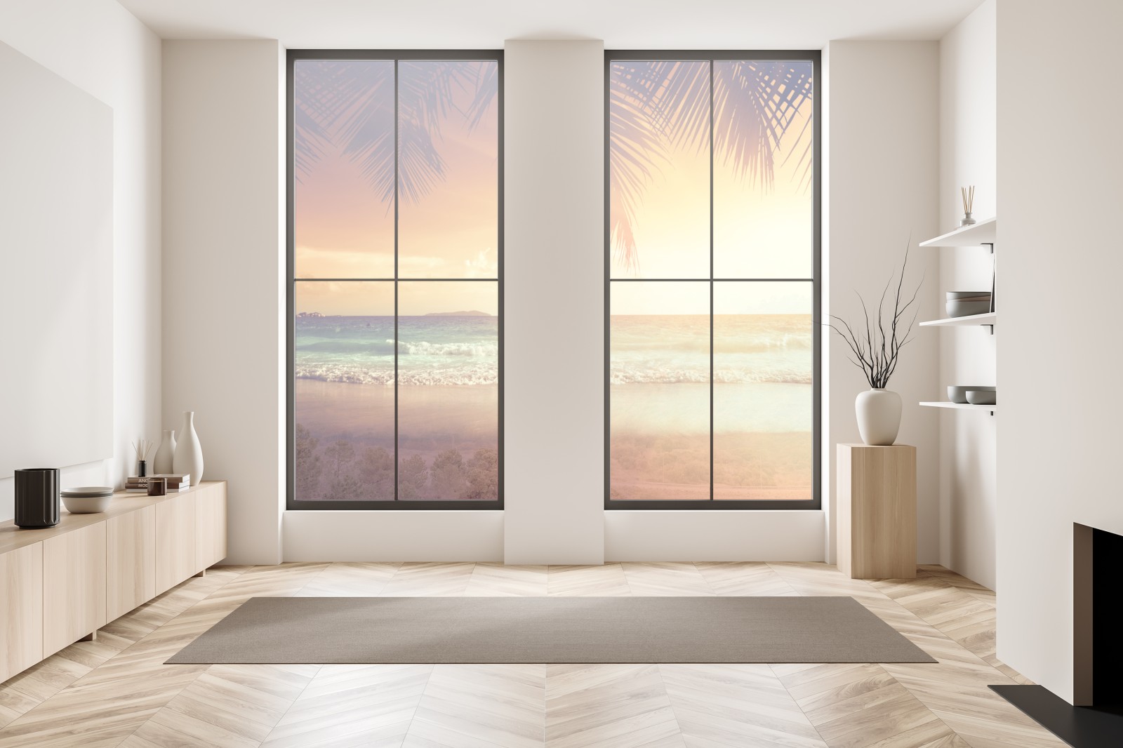Warmer Sonnenuntergang über einem ruhigen Strand mit Palmen, bringt tropische Ruhe und Atmosphäre in jeden Raum.