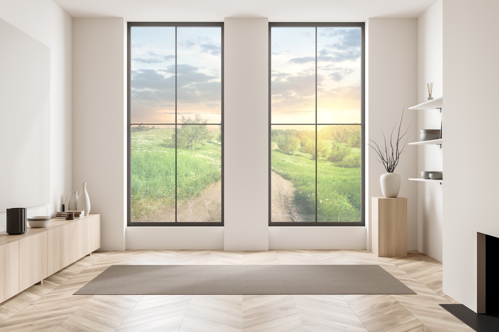 Ruhiger Sonnenuntergang über einem gewundenen Feldweg durch üppige Frühlingswiesen, perfekt um Natur ins Zuhause zu holen.