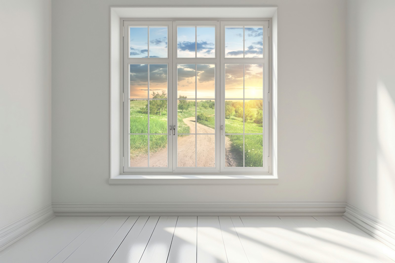 Fensteraufkleber sonnenuntergang über einem feldweg durch grüne wiese
