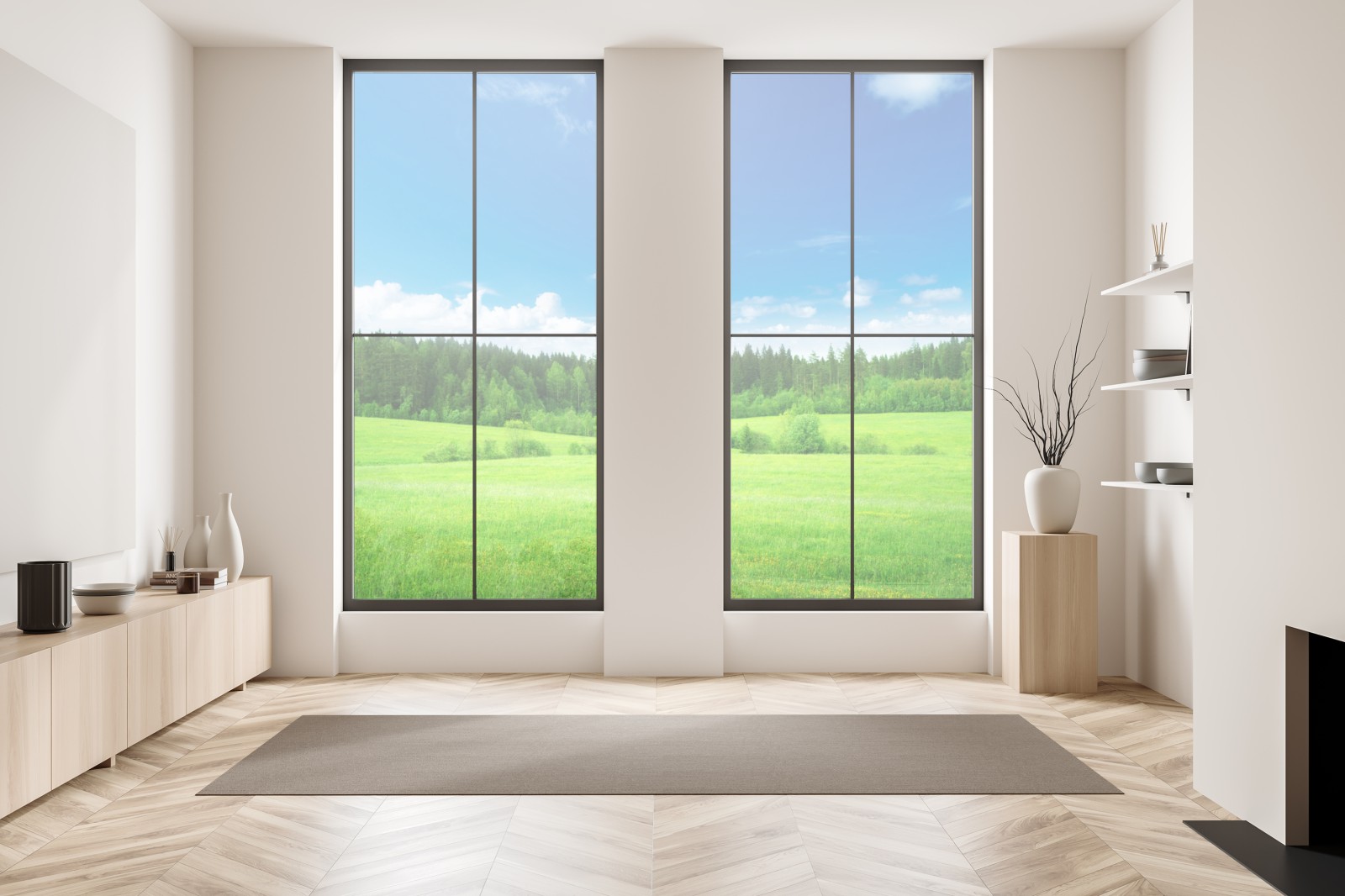 Bringen Sie die Ruhe einer Frühlingswiese in Ihr Zuhause mit diesem lebendigen Landschaftsbild aus saftigen Feldern, dichtem Wald und klarem Himmel.