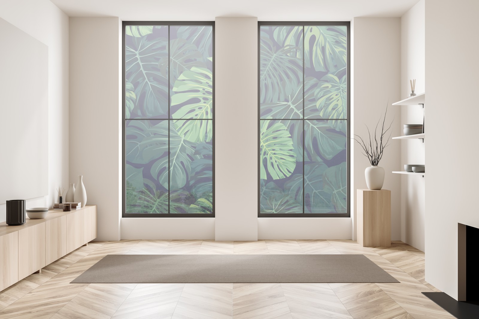 Üppiges Muster aus Monstera-Blättern bringt leuchtendes Grün und natürliche Atmosphäre in jeden Raum und eignet sich ideal als biophiles Highlight.