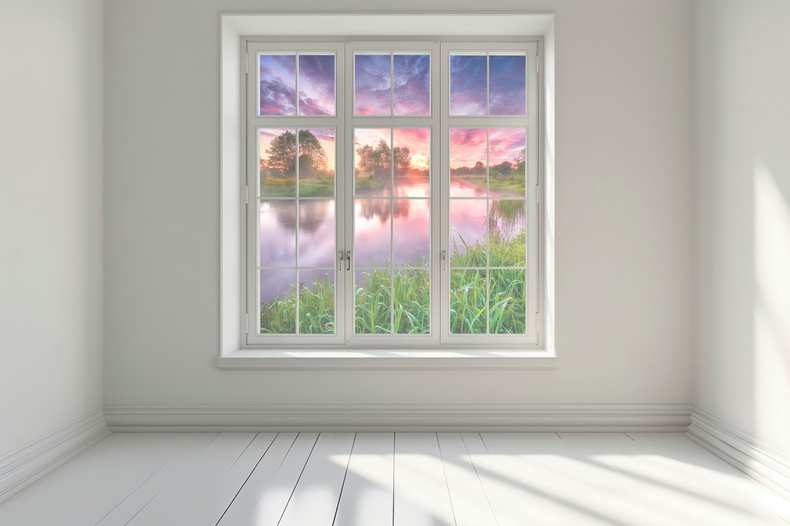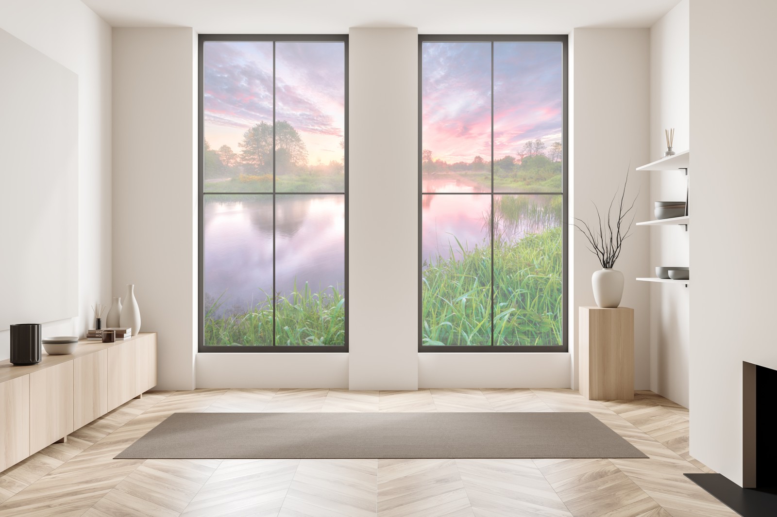 Erleben Sie die ruhige Stimmung eines sommerlichen Sonnenaufgangs am Fluss, lebendige Farben und natürliche Harmonie für jeden Raum.