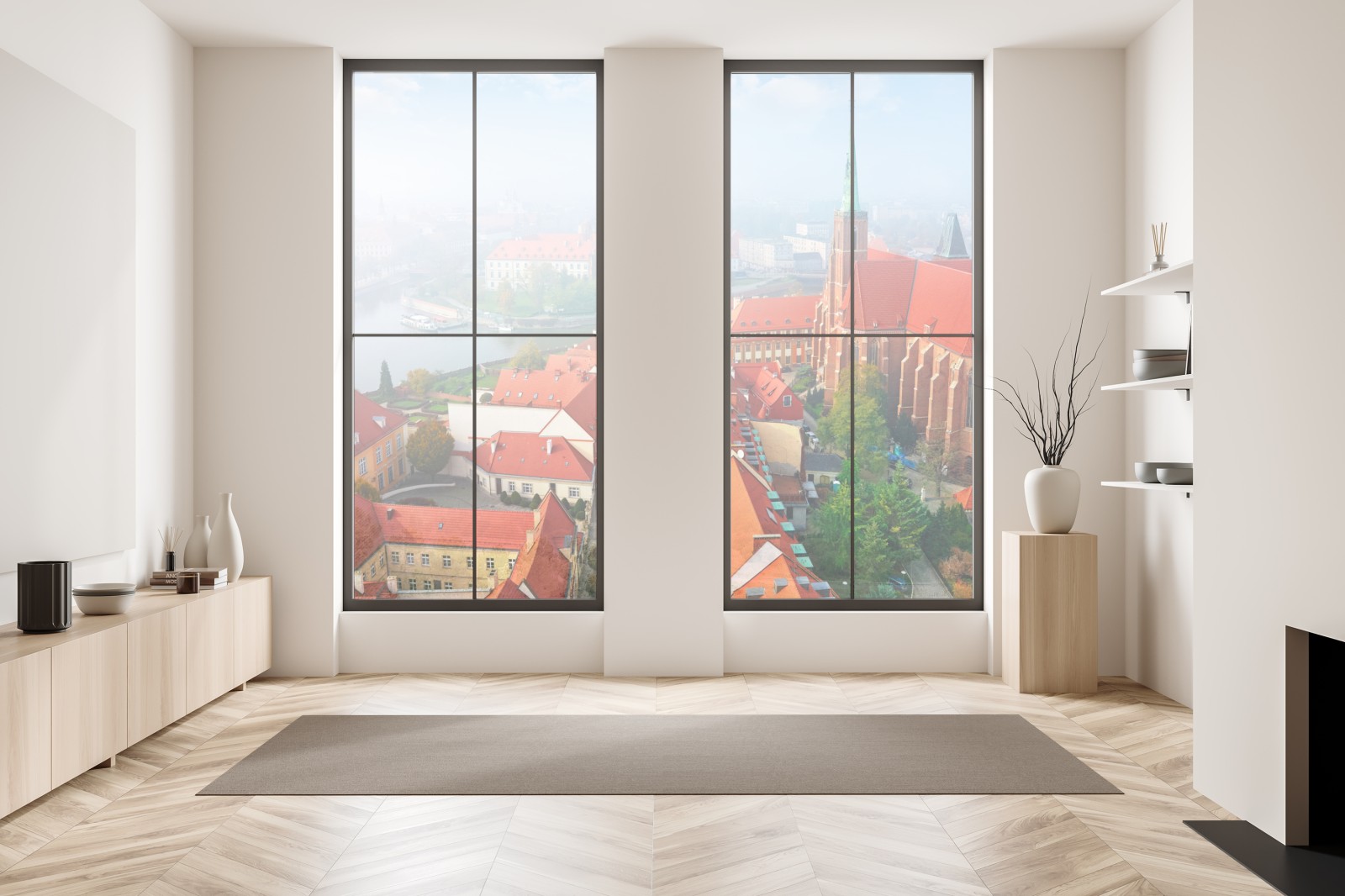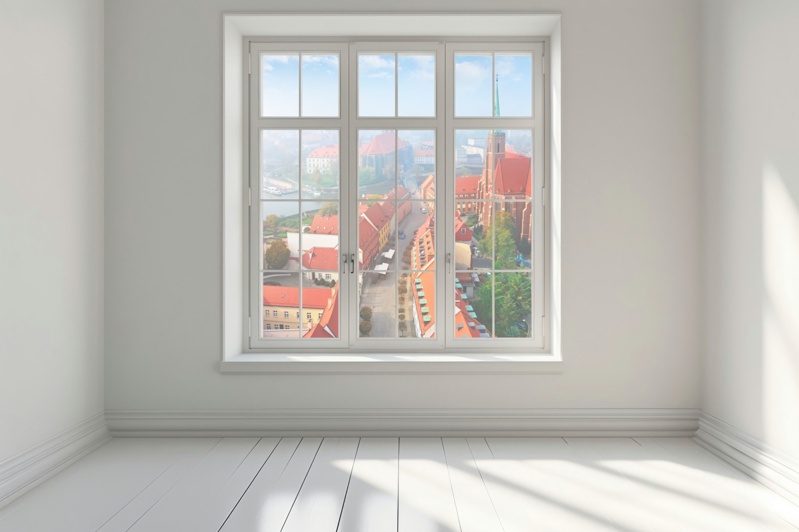 Fensteraufkleber neblige europäische stadtszene mit roten dächern