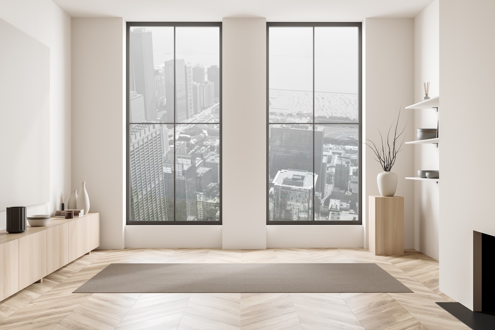 Ein eindrucksvolles monochromes Luftbild einer modernen Stadtsilhouette am Ufer, ideal um jedem Raum urbane Eleganz zu verleihen.