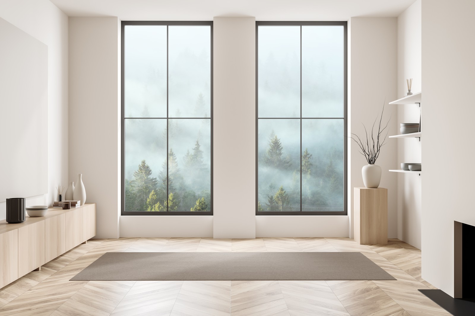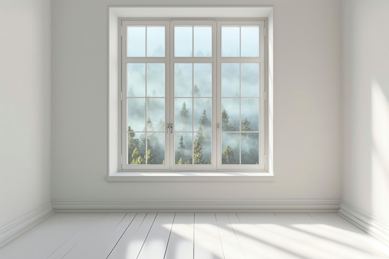 Ein ruhiger nebliger Fichtenwald im weichen Morgenlicht, ideal um natürliche Atmosphäre und Gelassenheit ins Zuhause zu bringen.