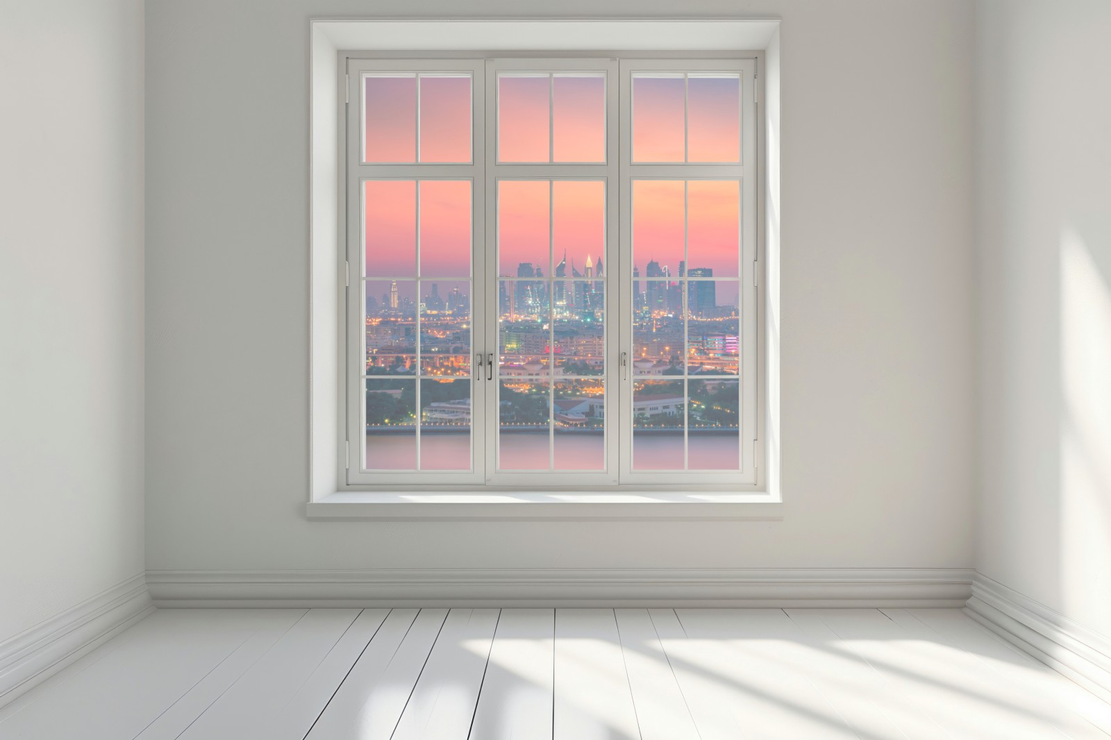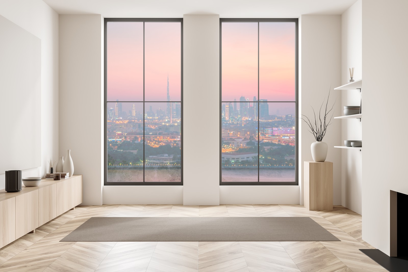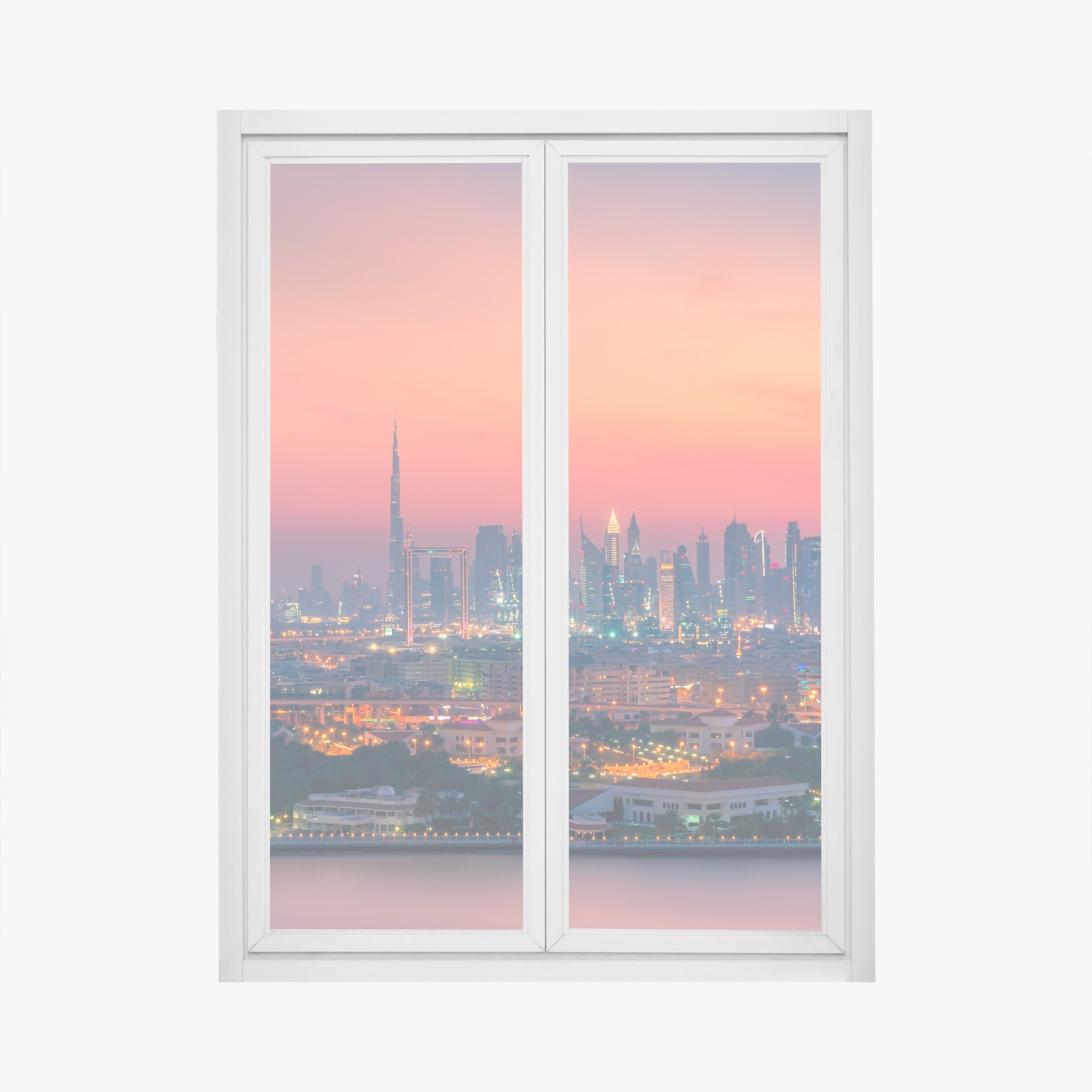 Ein lebendiges Panorama der Skyline von Dubai bei Sonnenuntergang, das warme Farben und Stadtlichter kombiniert und jeden Raum zum Blickfang macht.