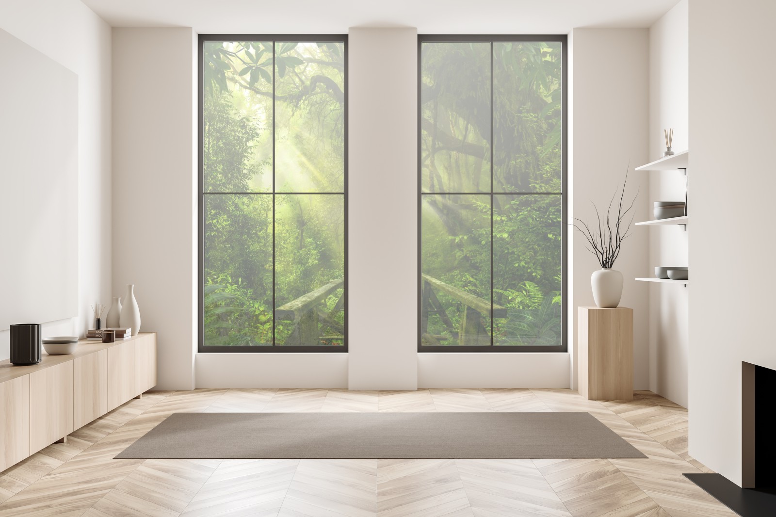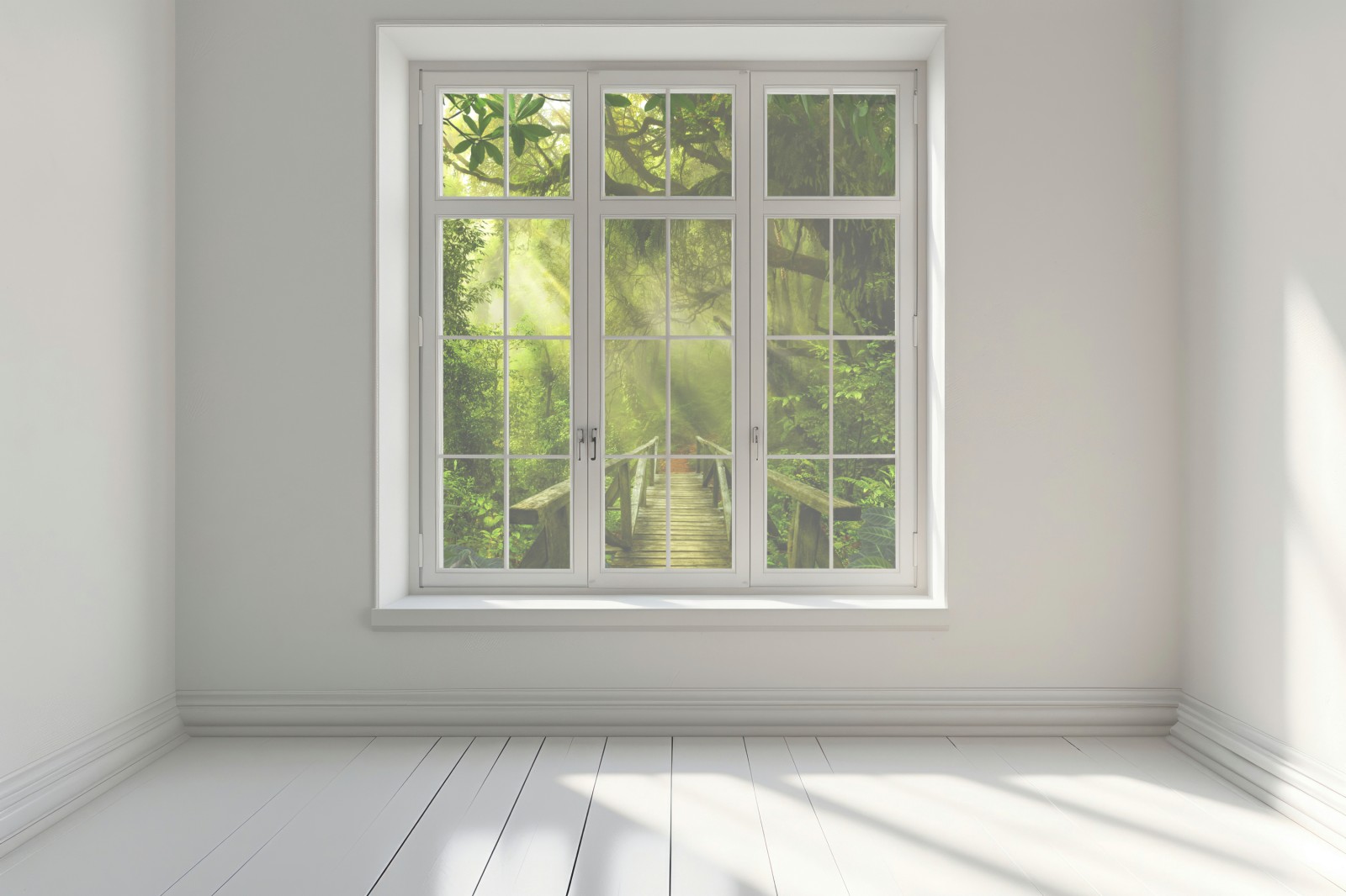 Ein ruhiger, sonnenbeschienener Waldweg, der üppiges Grün und Ruhe ins Zuhause bringt.