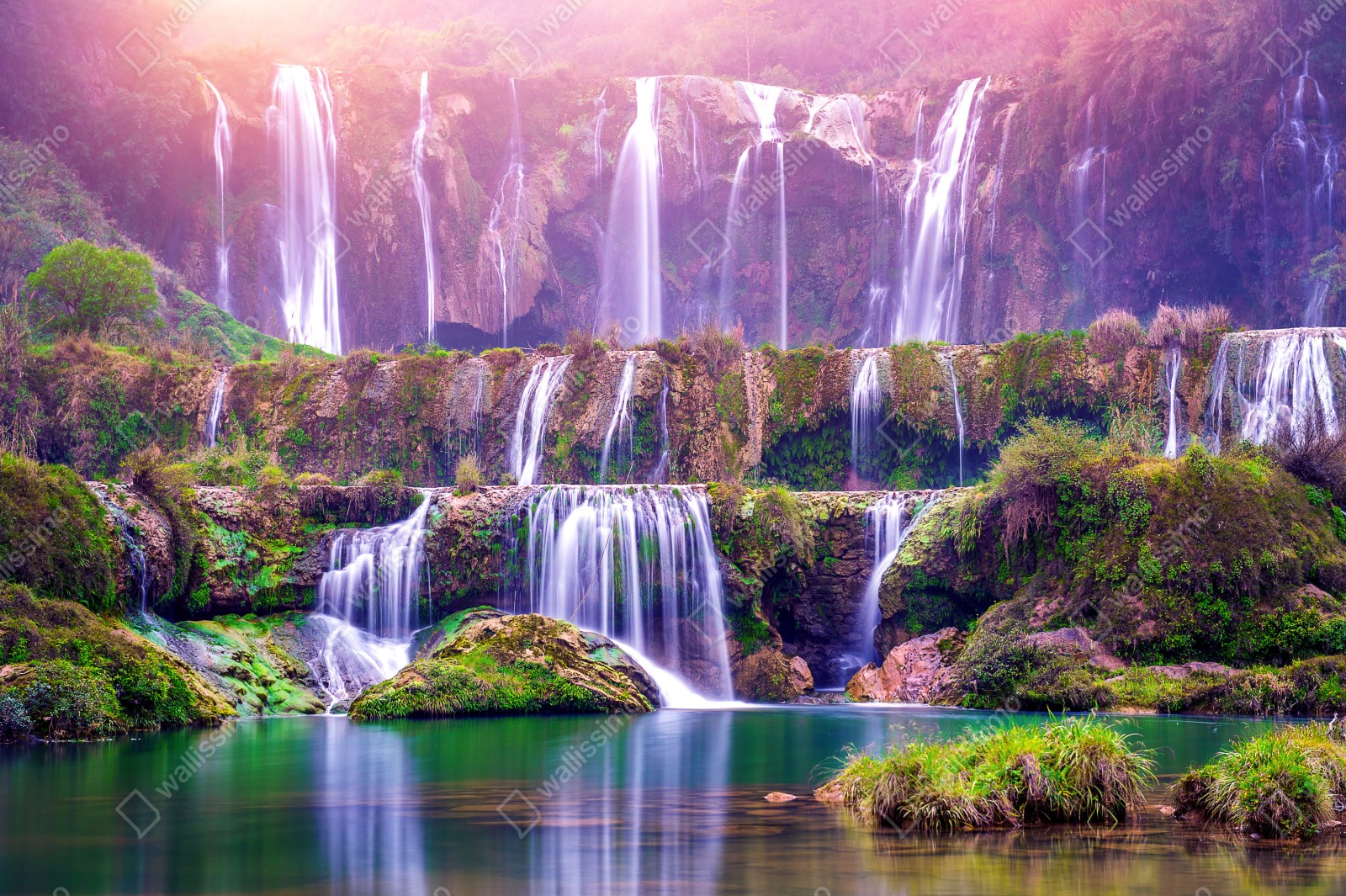 Bringen Sie beruhigende natürliche Energie in Ihren Raum mit einer lebendigen Panoramaaufnahme des Jiulong-Wasserfalls in Luoping, China.