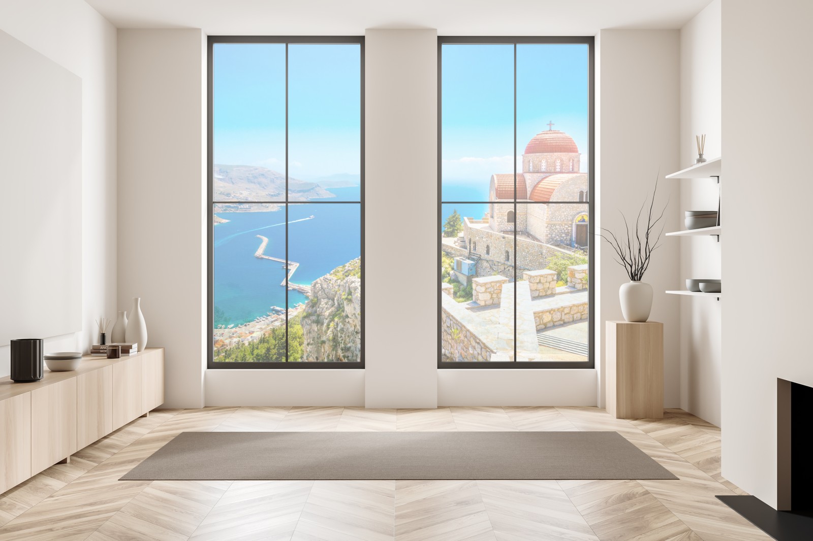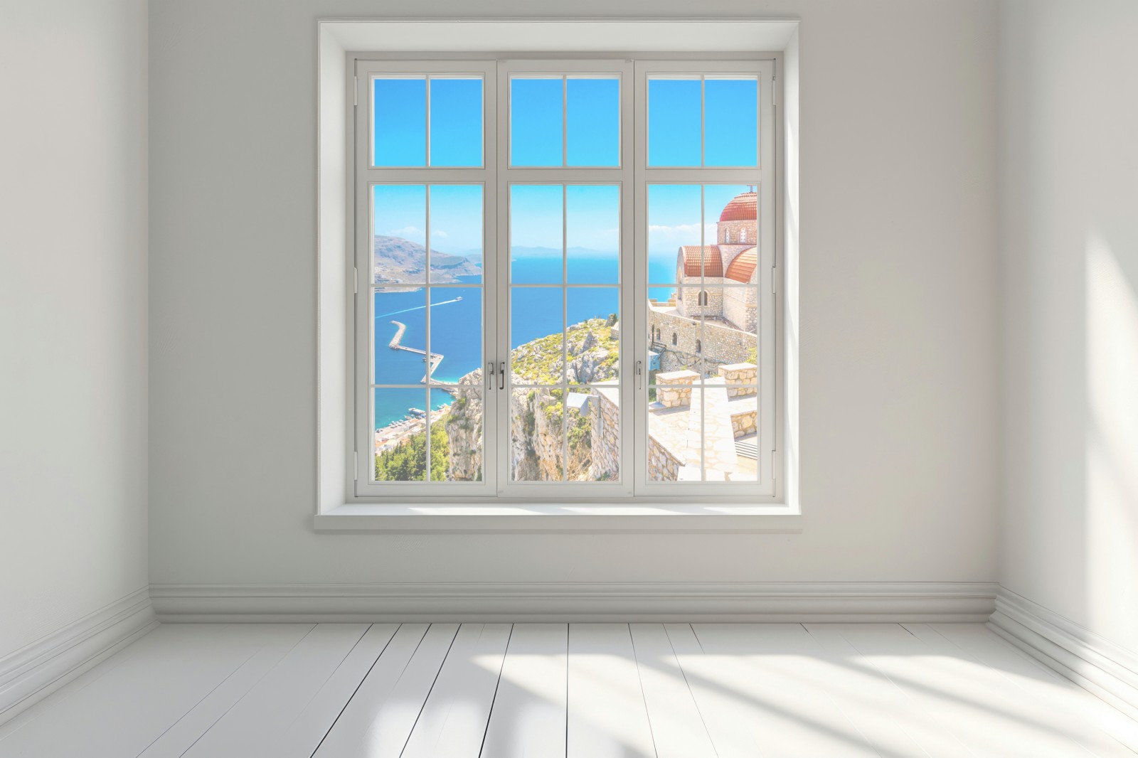 Fensteraufkleber griechische kirche auf klippe über dem meer