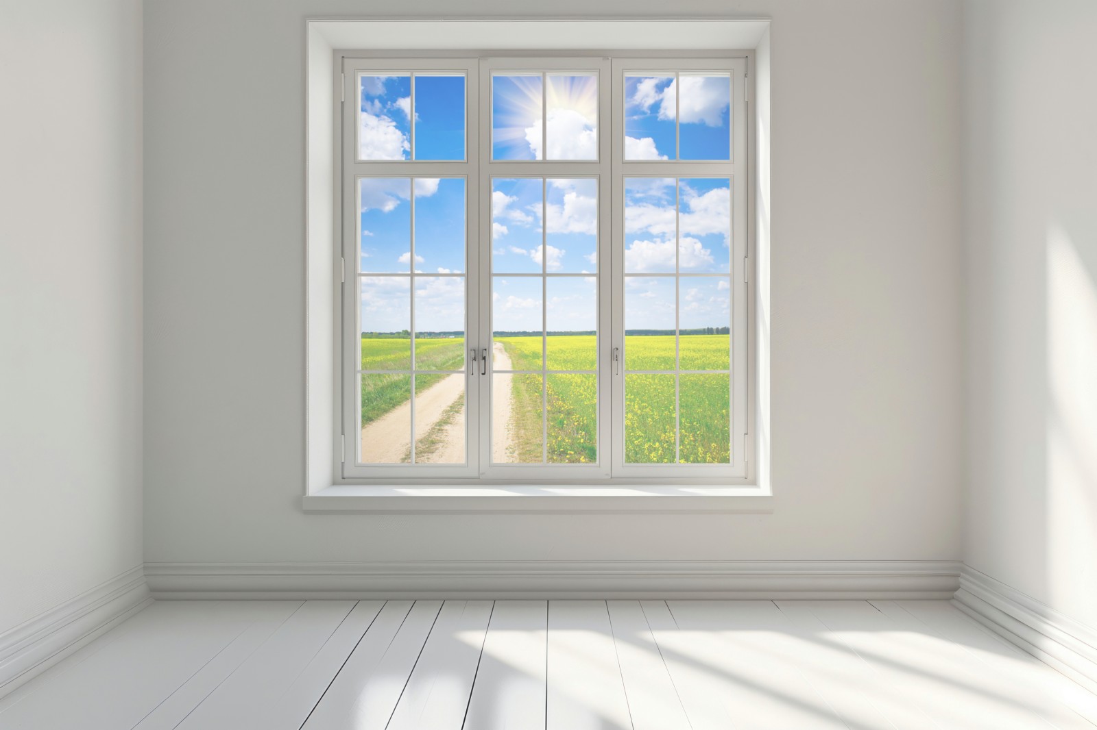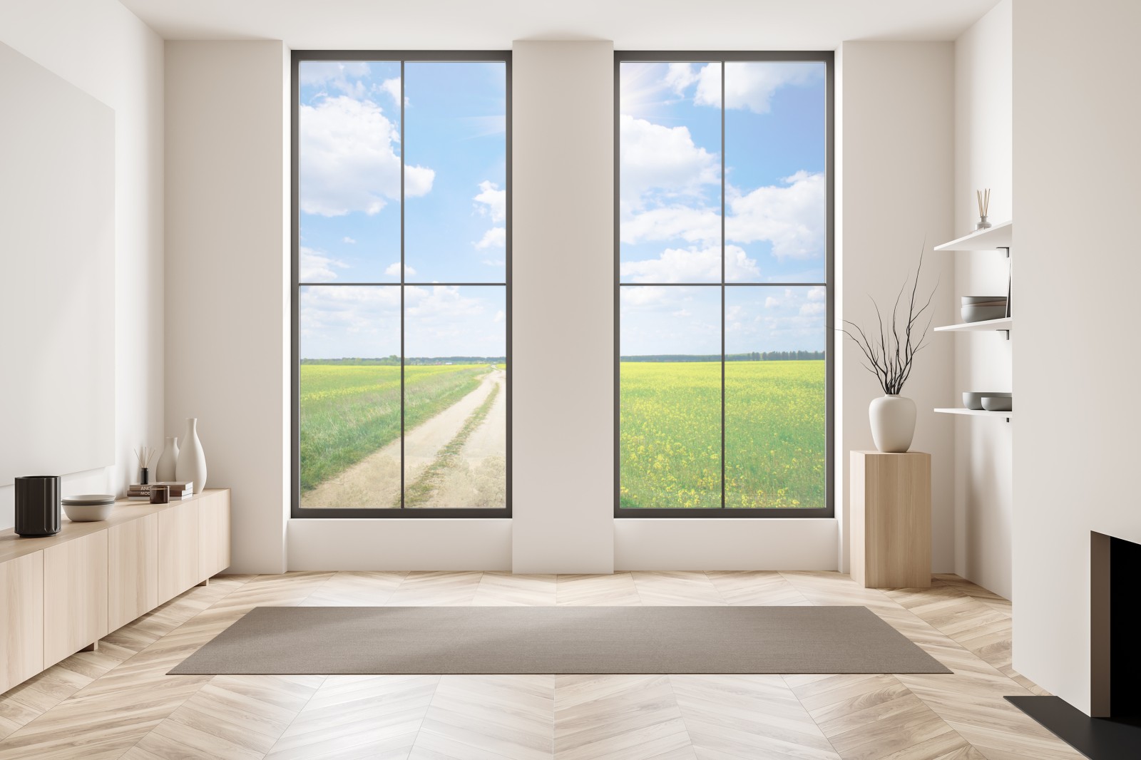 Helle gelbe Rapsfelder erstrecken sich bis zum Horizont unter einem leuchtend blauen Himmel und verleihen jedem Raum Ruhe und Weitläufigkeit.