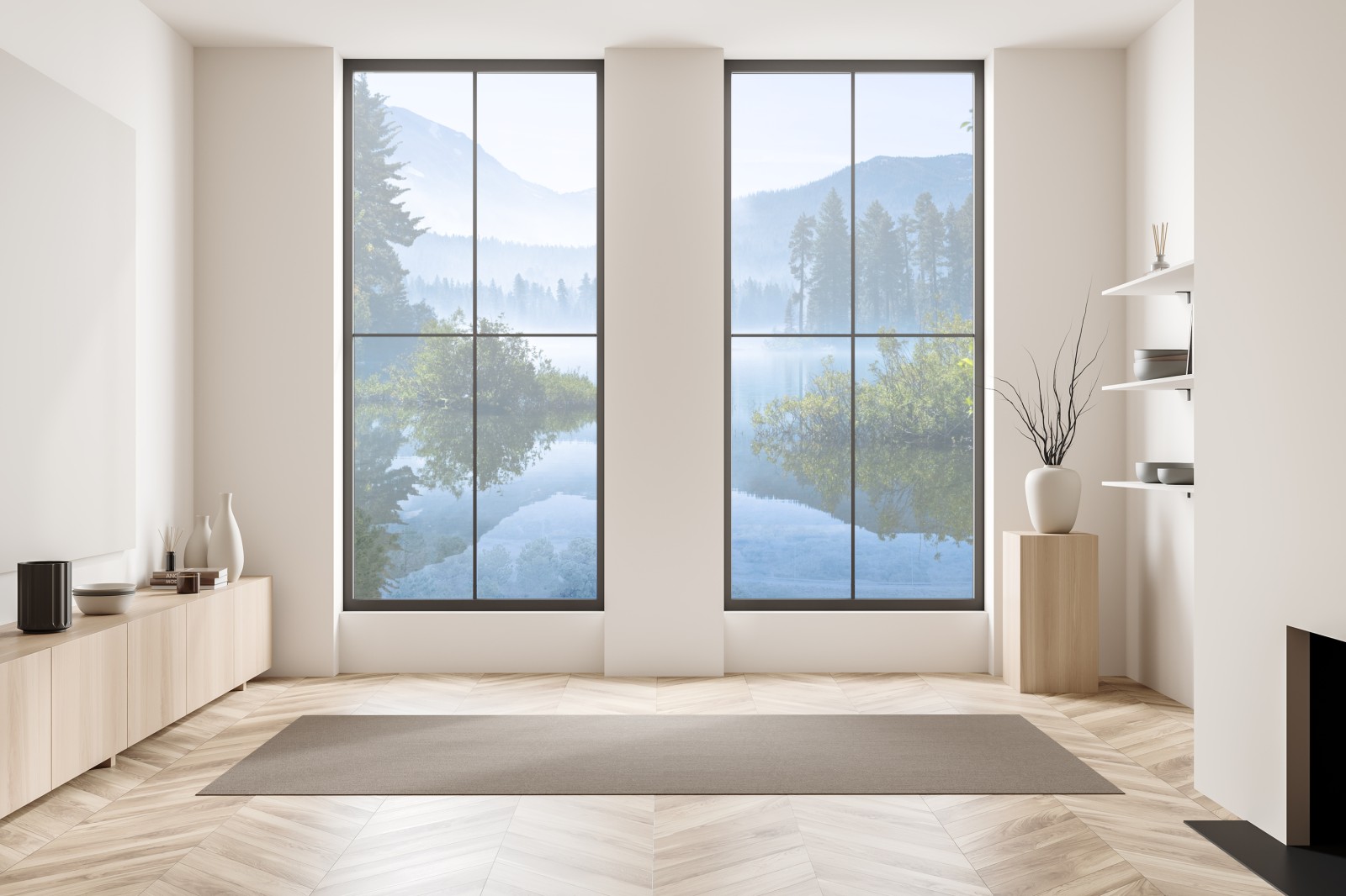 Ein ruhiger, nebelverhangener Bergsee mit klarer Spiegelung und dichtem Kiefernwald, perfekt als beruhigendes Wandbild.
