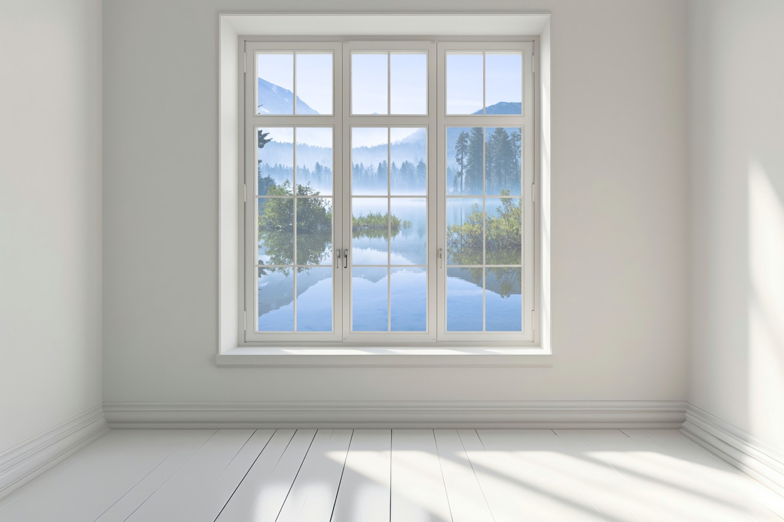 Fensteraufkleber nebliger bergsee mit spiegelnder oberfläche