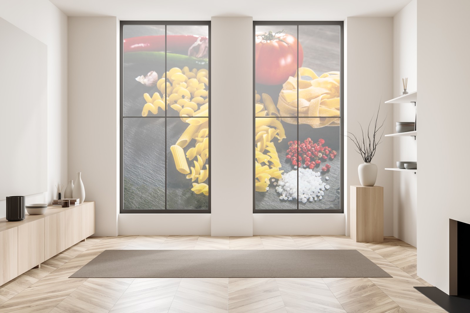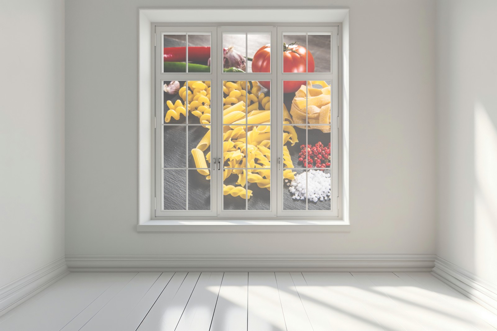 Fensteraufkleber verschiedene trockene nudeln und frische zutaten