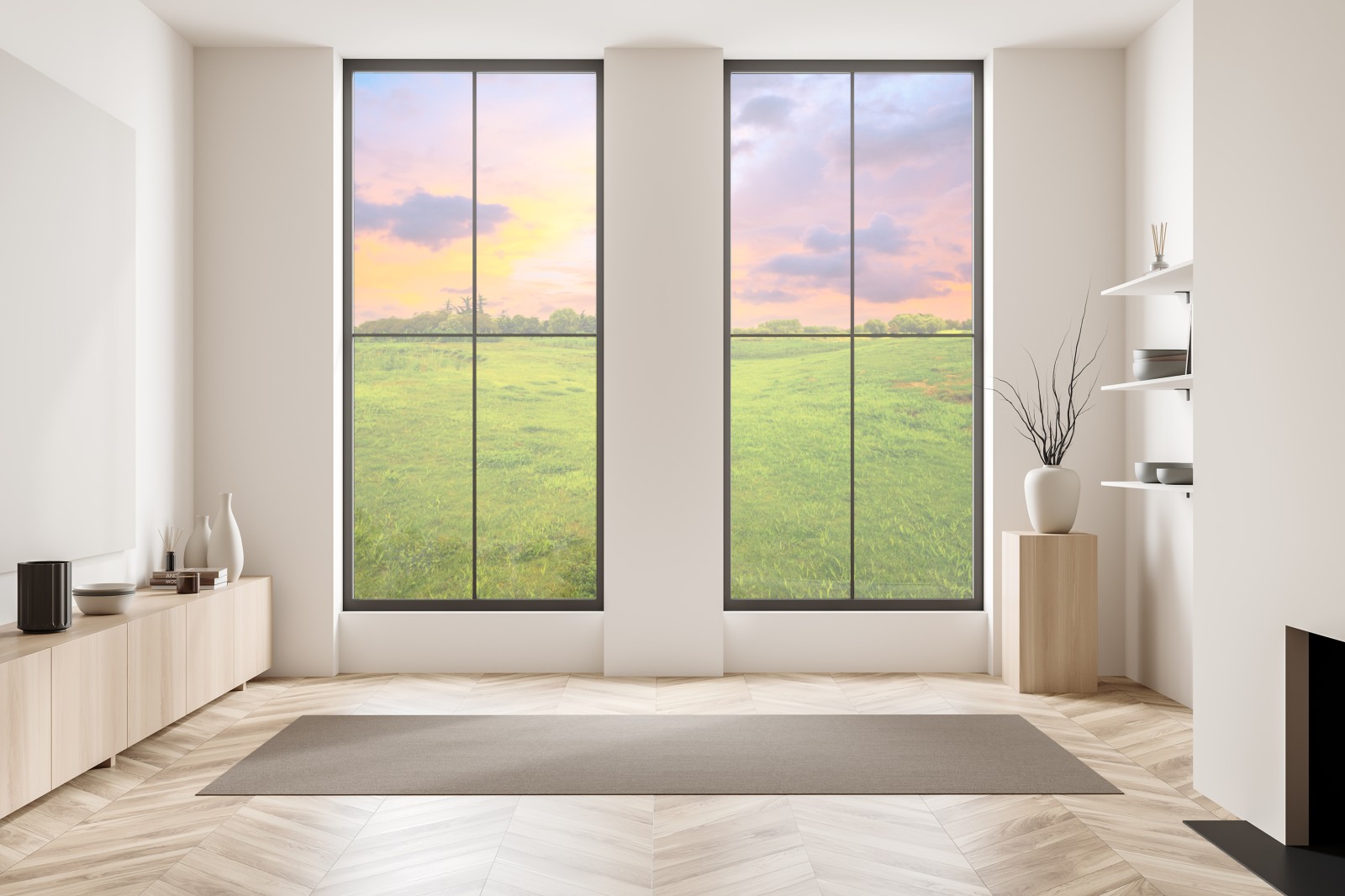 Ein leuchtender Sonnenuntergang über einer üppigen grünen Wiese bringt Wärme und Ruhe in jeden Raum.