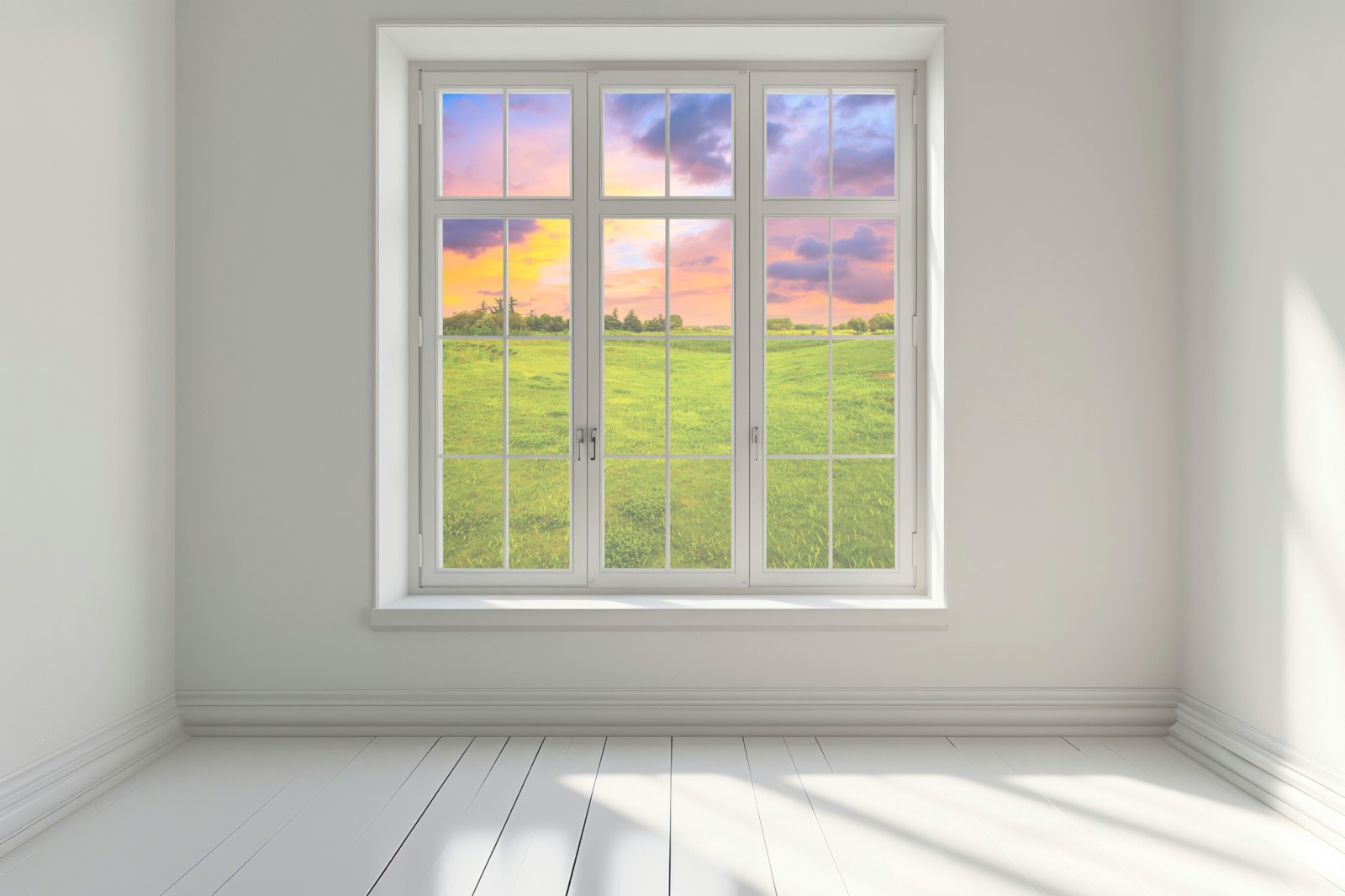 Fensteraufkleber sonnenuntergang über grüner wiese