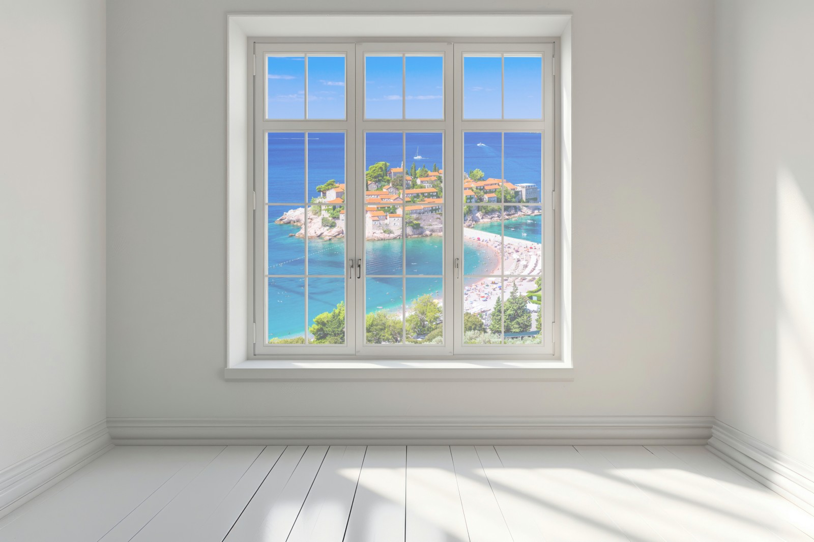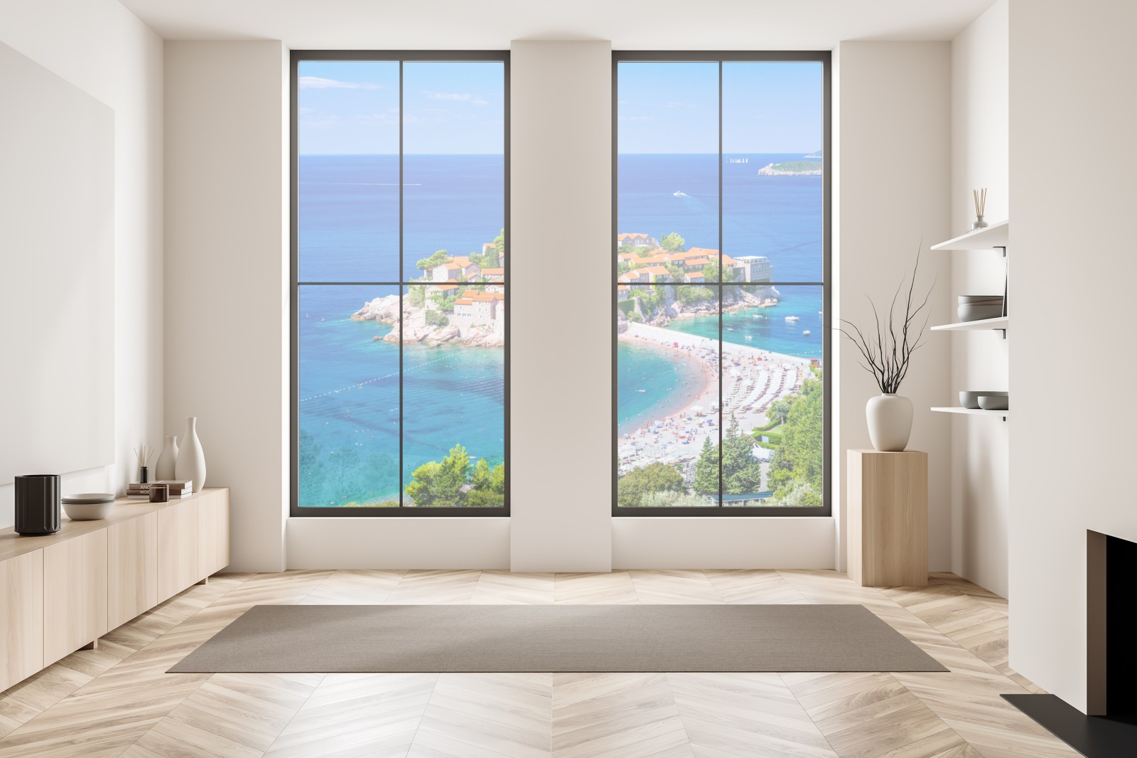 Atemberaubender Blick auf das historische Inselresort Sveti Stefan mit türkisblauem Wasser und Sandstrand, ideal für stilvolle Wanddekoration.
